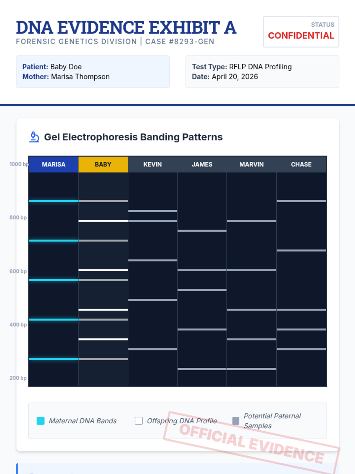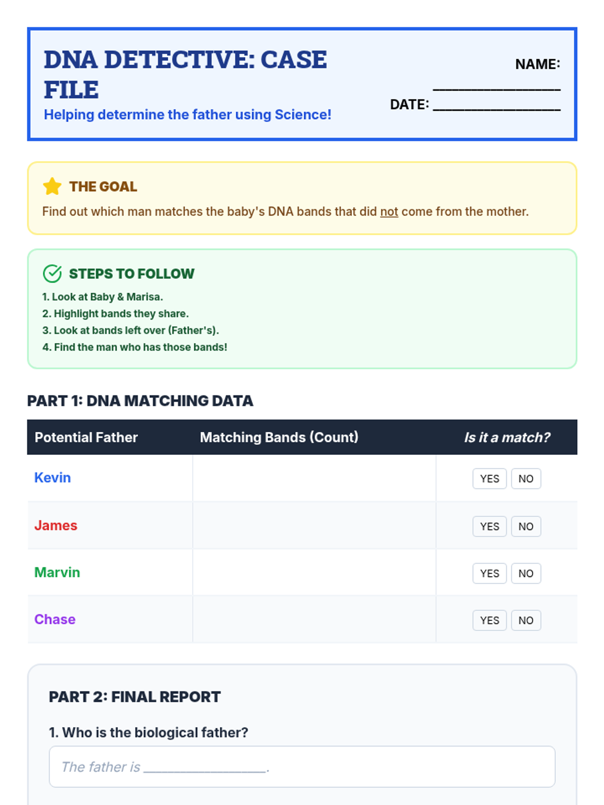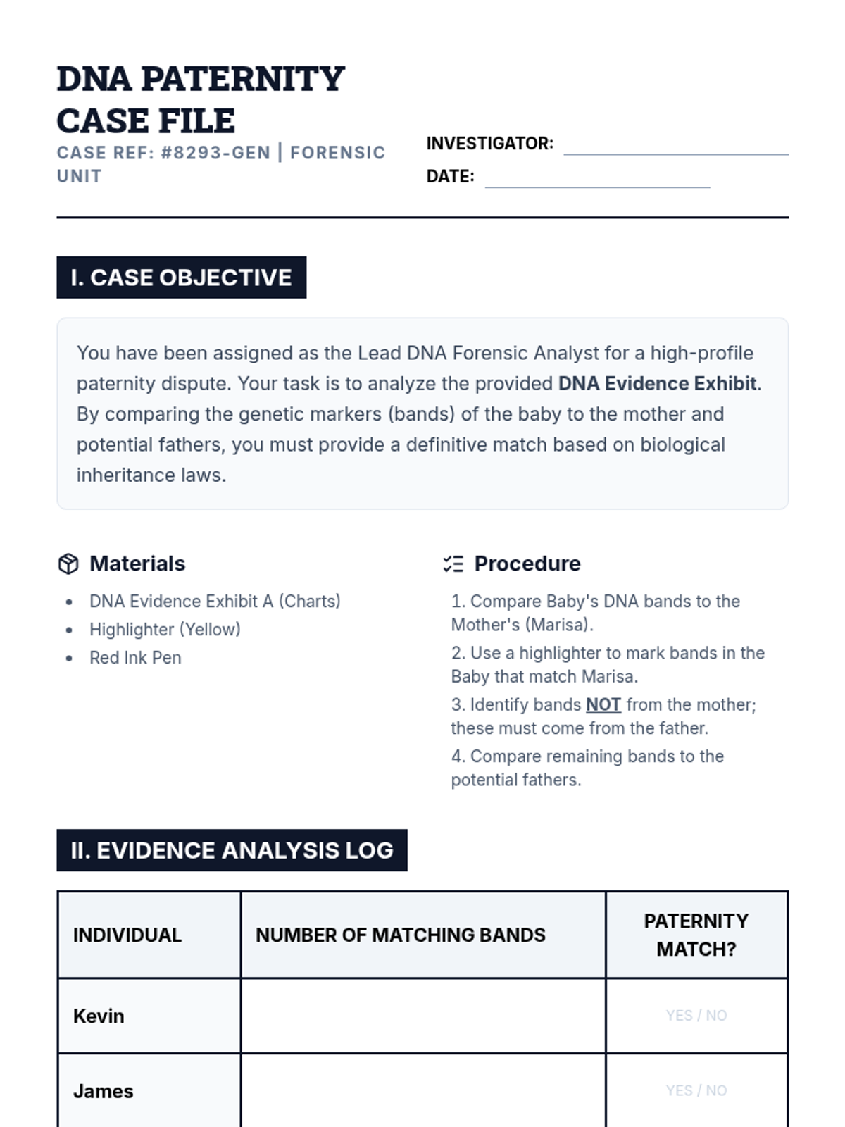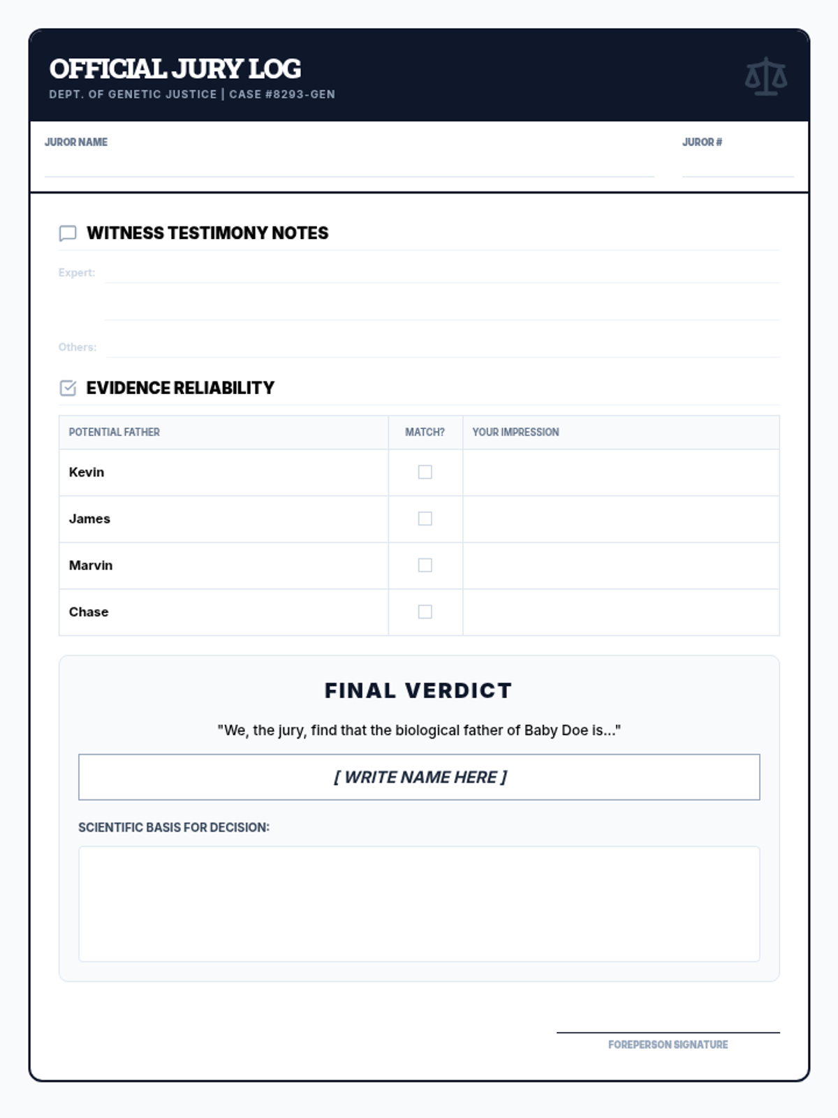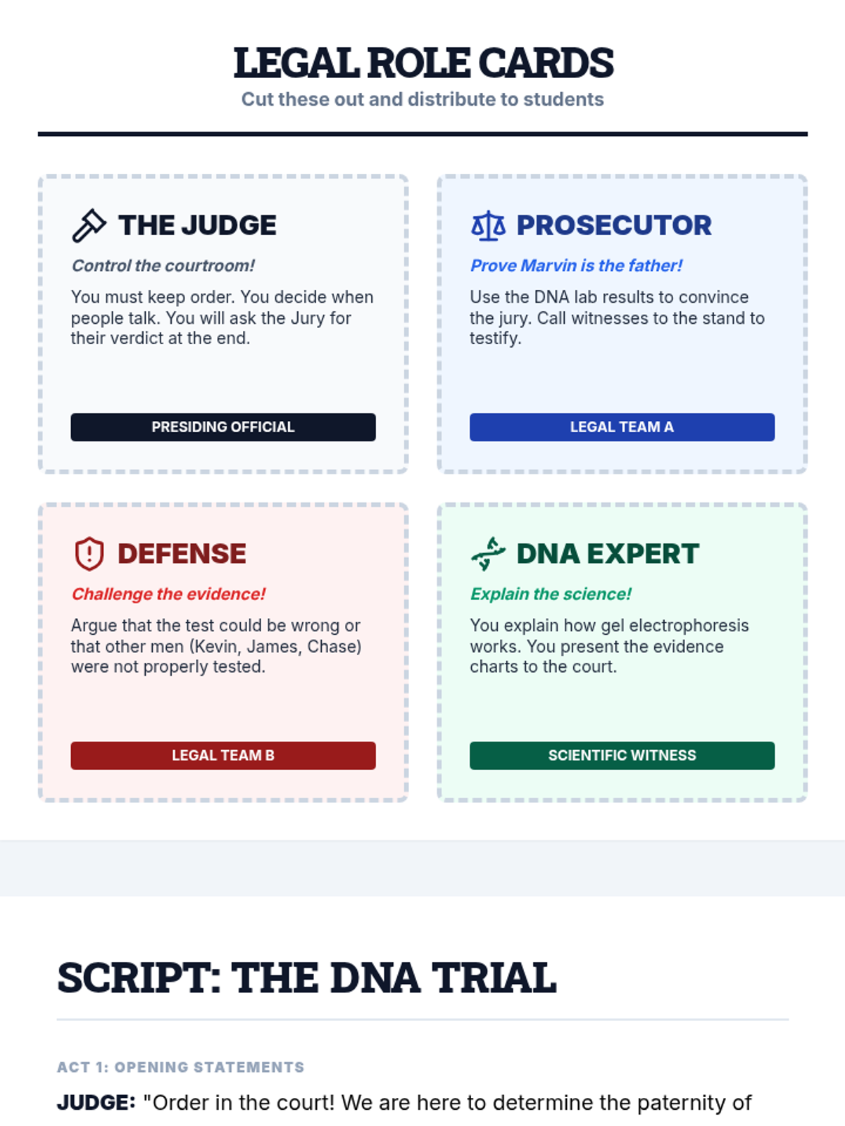 A set of printable role cards and a structured script for the paternity trial role-play activity. Includes roles for a judge, lawyers, experts, and witnesses, with embedded sentence stems for student dialogue.
