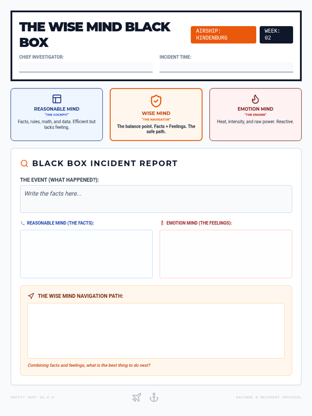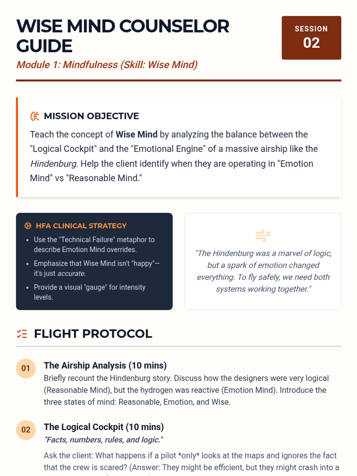 Counselor guide for Week 2 of the Survival and Salvage DBT program, focusing on the 'Wise Mind' skill using the Hindenburg as a metaphor for balancing logic and emotion.