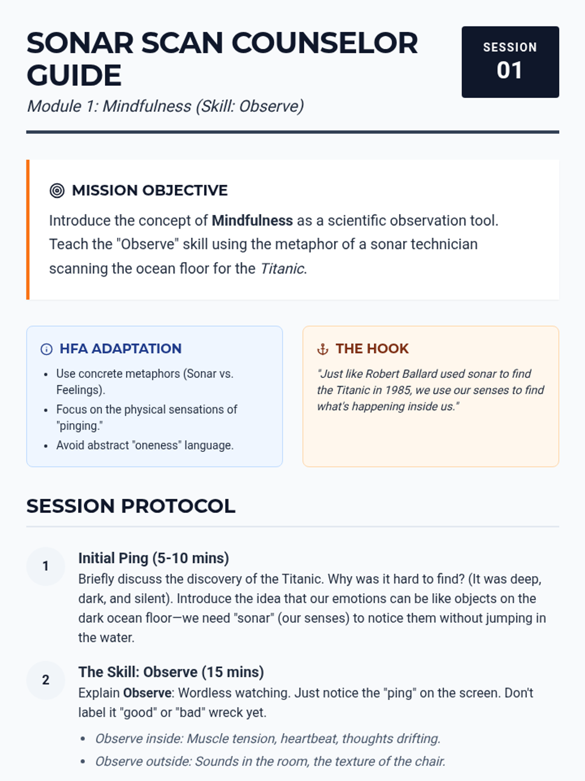 Counselor guide for Week 1 of the Survival and Salvage DBT program, focusing on the 'Observe' mindfulness skill using a Titanic sonar metaphor.