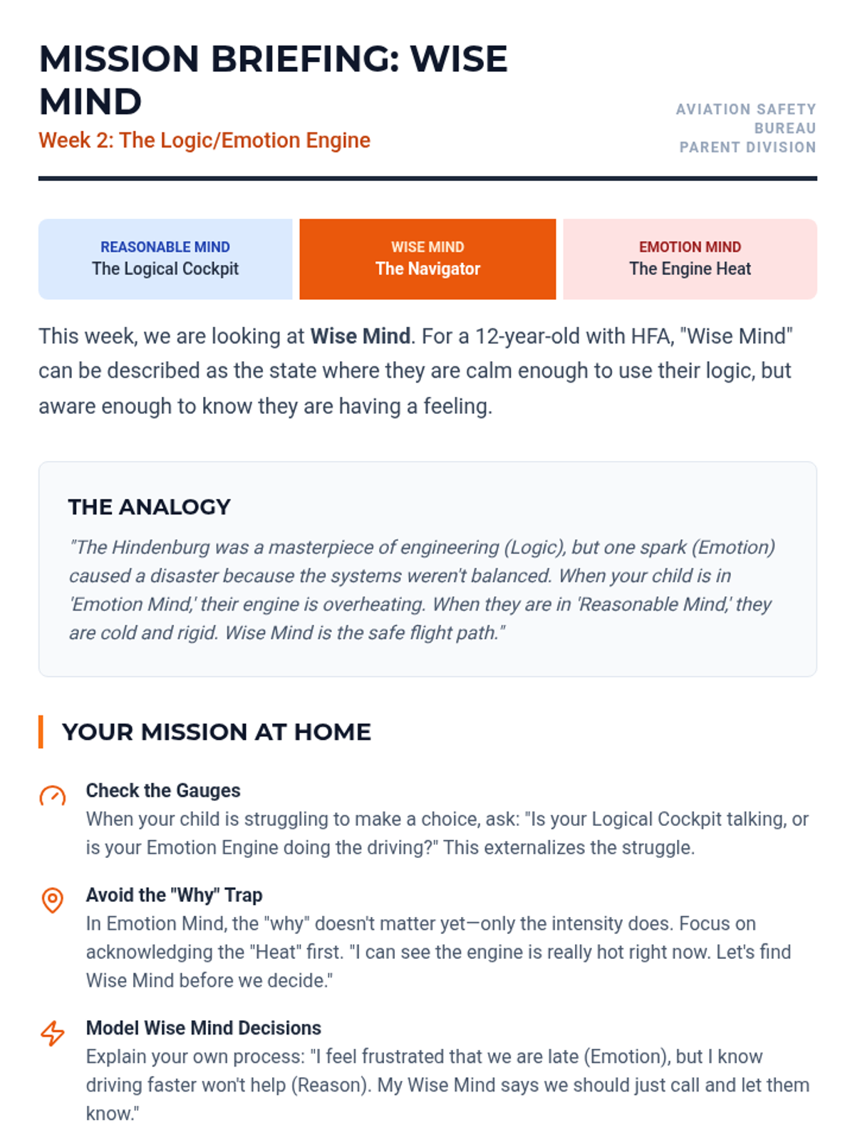 Parent guide for Week 2 of the Survival and Salvage DBT program, introducing the 'Wise Mind' concept using aviation metaphors for autism-friendly communication.