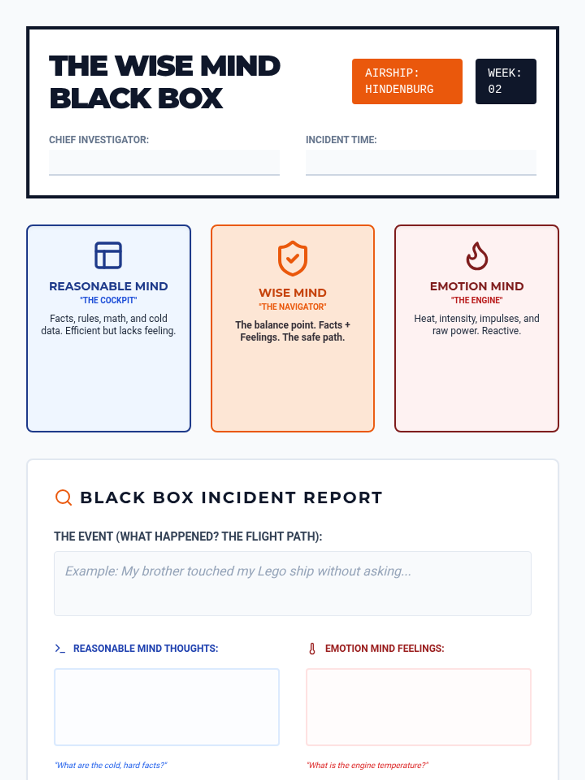 A student-facing worksheet for identifying the three states of mind (Reasonable, Emotion, and Wise) using the Hindenburg airship metaphor. Includes an incident report section for personal reflection.