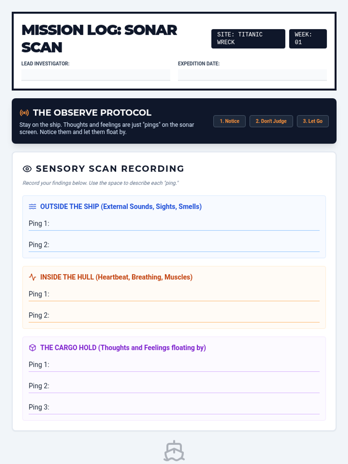 A student-facing worksheet for practicing the 'Observe' skill in DBT, themed around a Titanic sonar search mission. Includes space for recording external, internal, and cognitive 'pings'. Revised to fit a single page and provide better writing space.