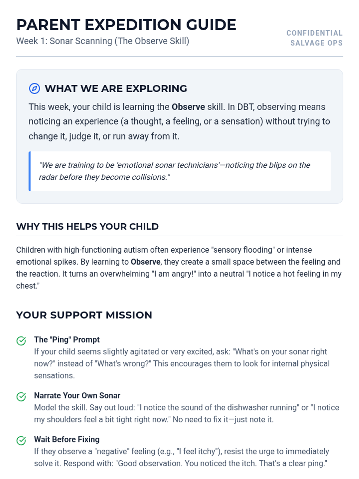 Parent guide for Week 1 of the Survival and Salvage DBT program, explaining the 'Observe' skill and providing home-based strategies for children with HFA.