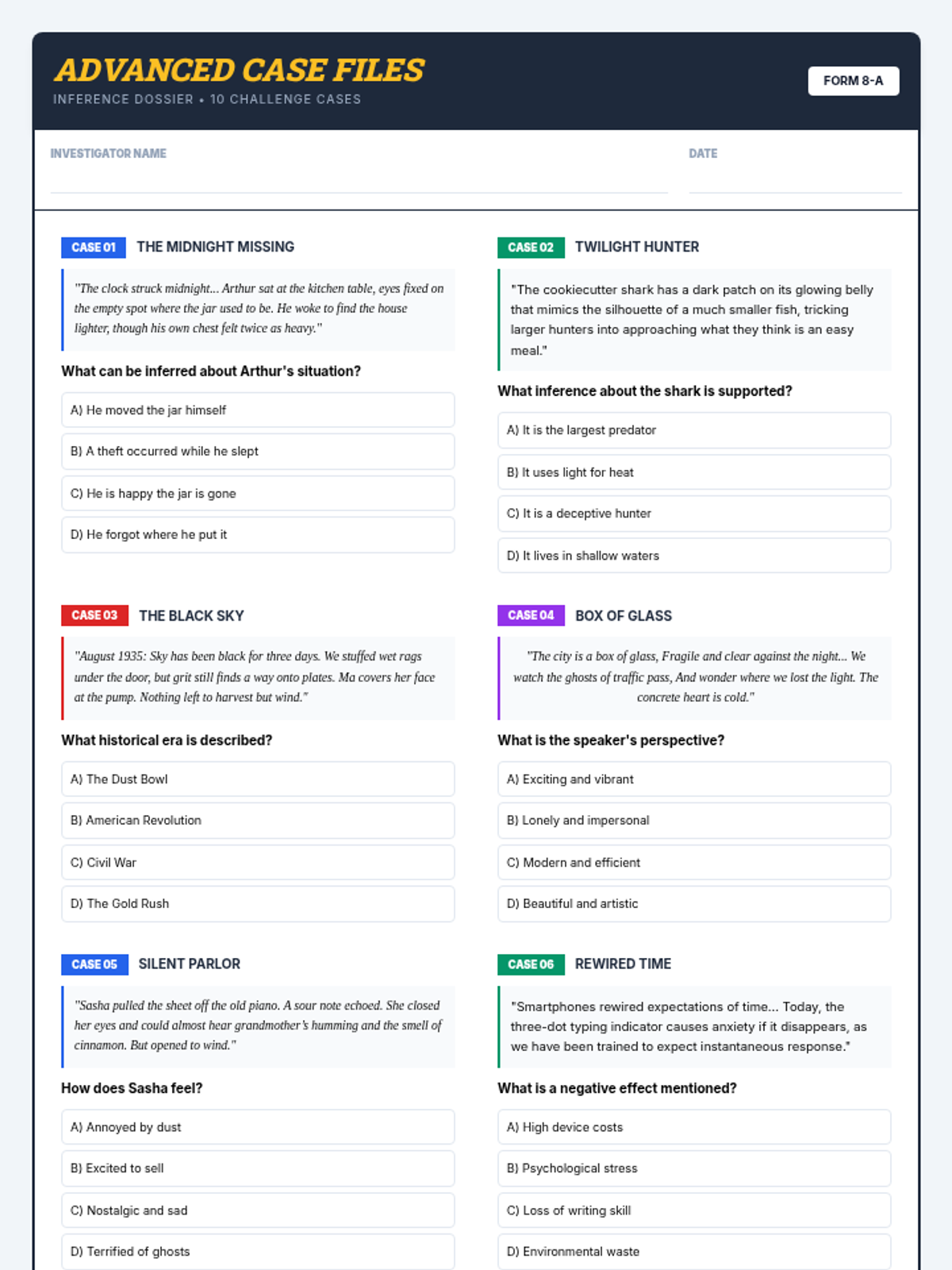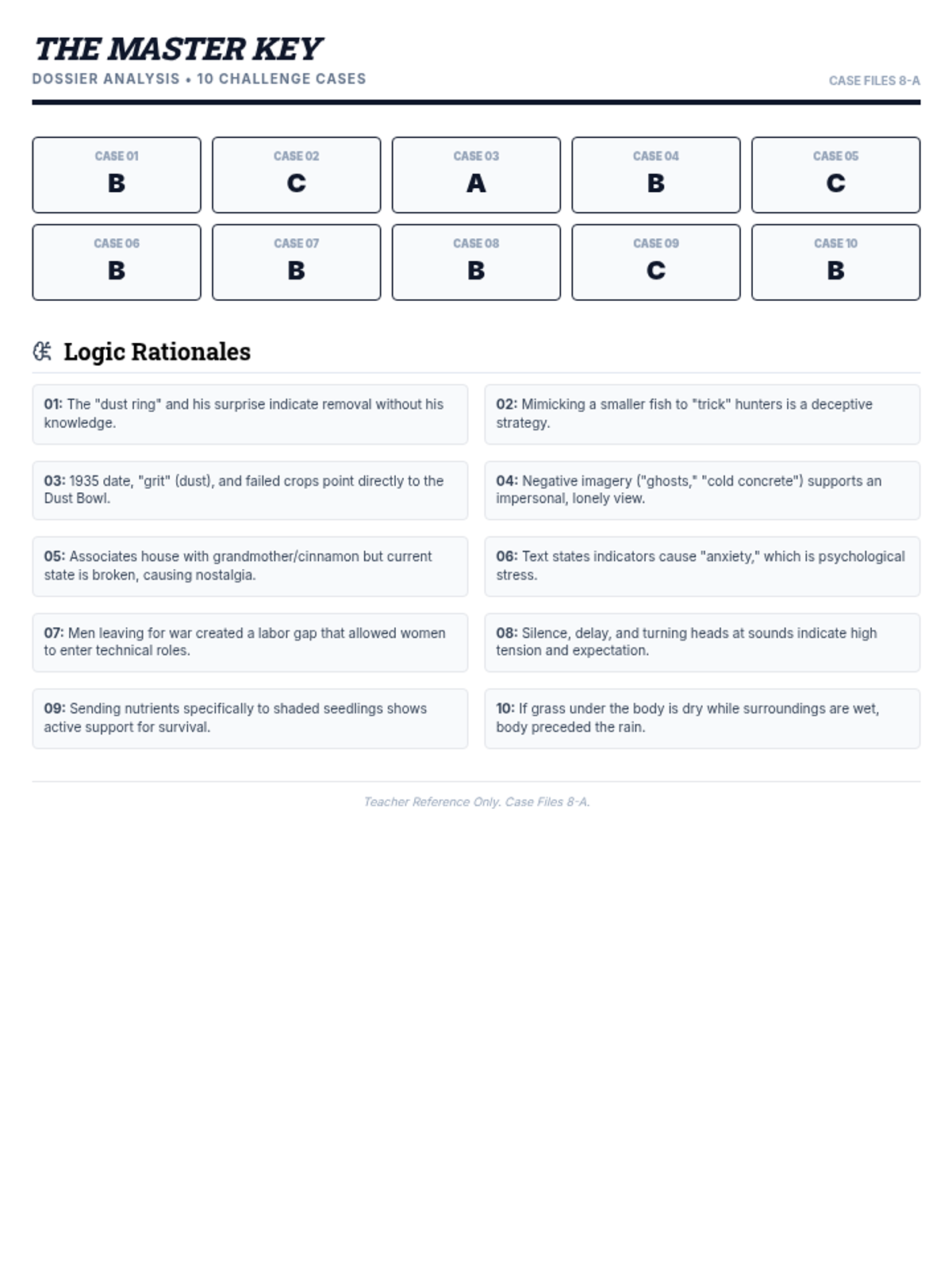 A student reference sheet defining key literary devices (Imagery, Dialogue, Narration, Indirect Characterization) with examples.