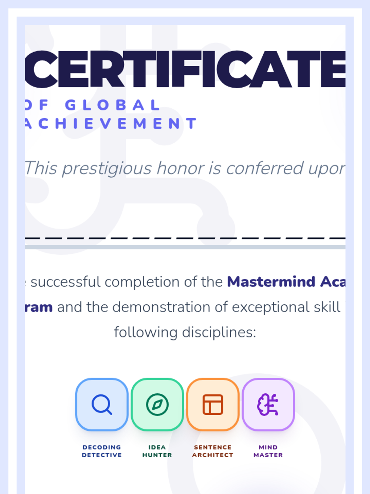 A graduation certificate for the Thinking Reading Architects program, recognizing achievements in decoding, idea construction, and sentence architecture. Theme: Mastermind Graduation.