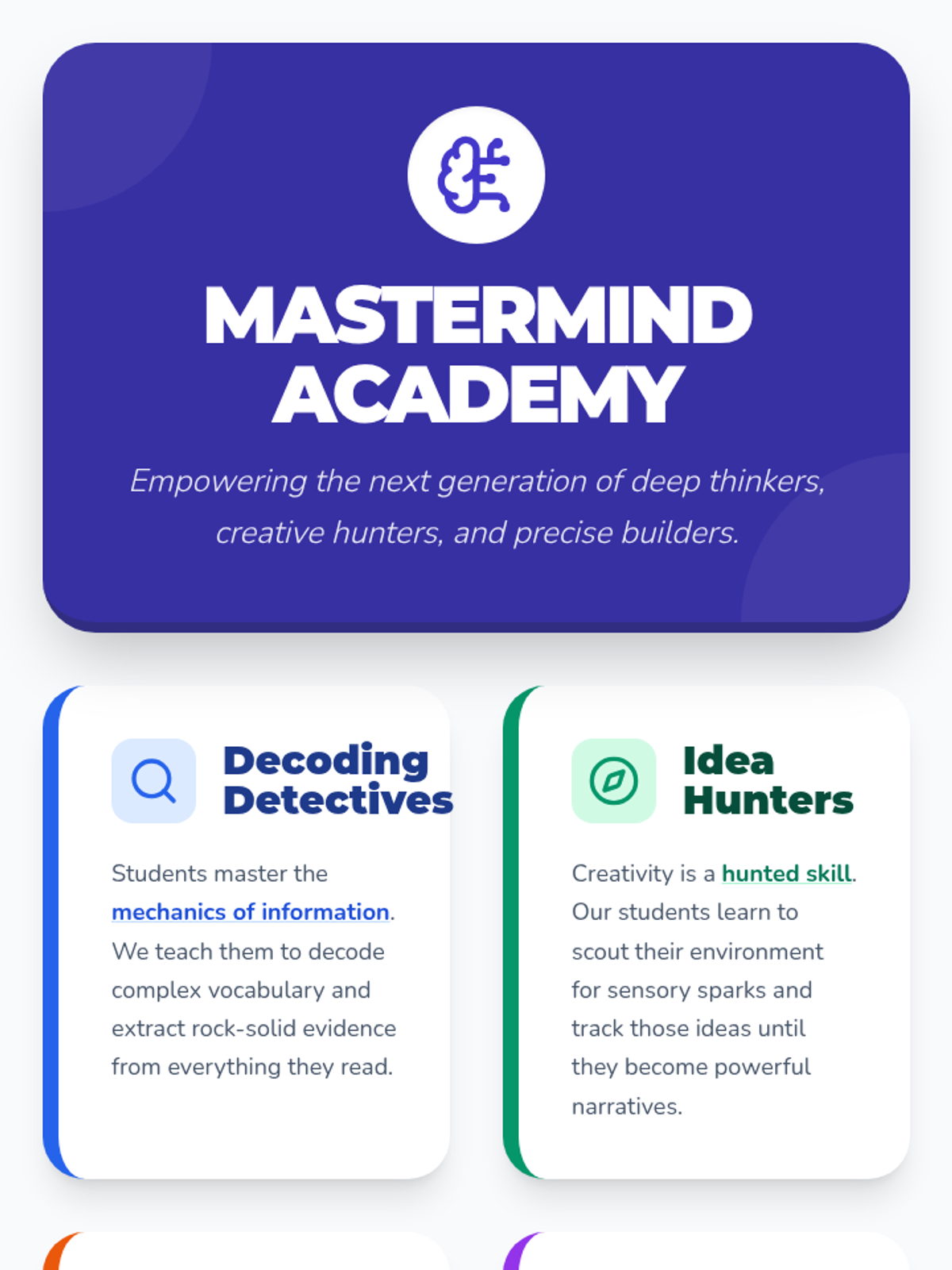An informational brochure for parents about the Thinking Reading Architects program, explaining the four core disciplines and providing a program overview. Theme: Mastery & Excellence.