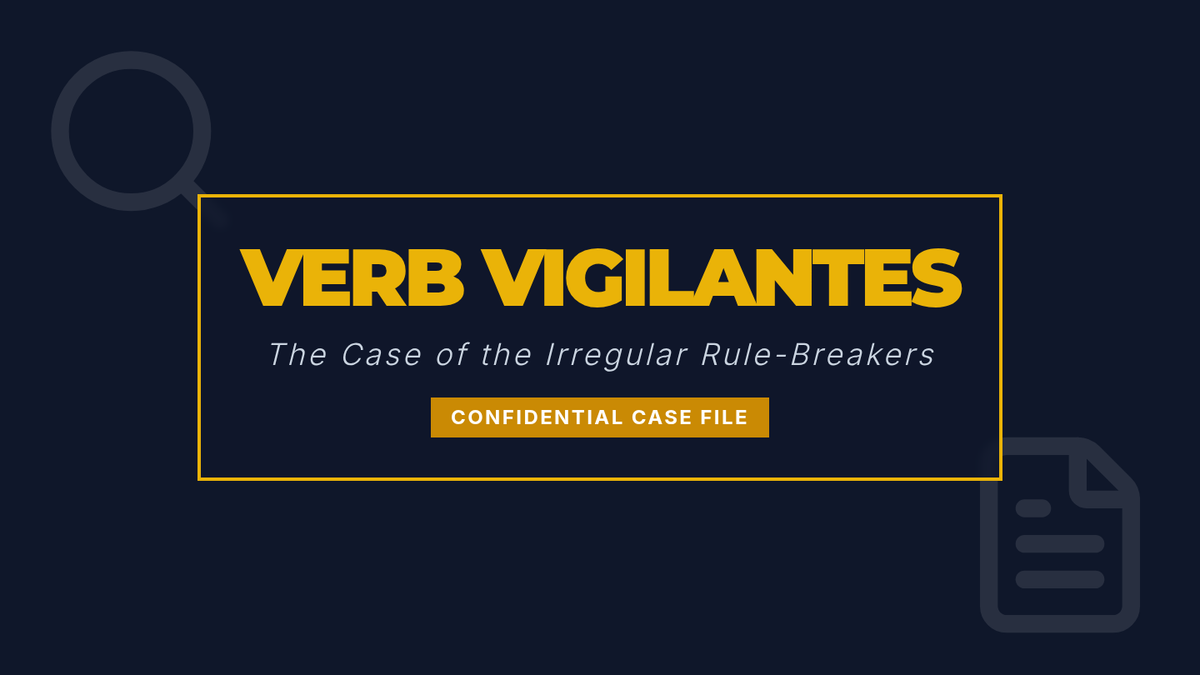 A visually engaging slide deck for teaching irregular past tense verbs to second graders, using a friendly detective theme with large fonts and simple definitions. Revised to replace 'Vigilantes' with 'Detectives'.