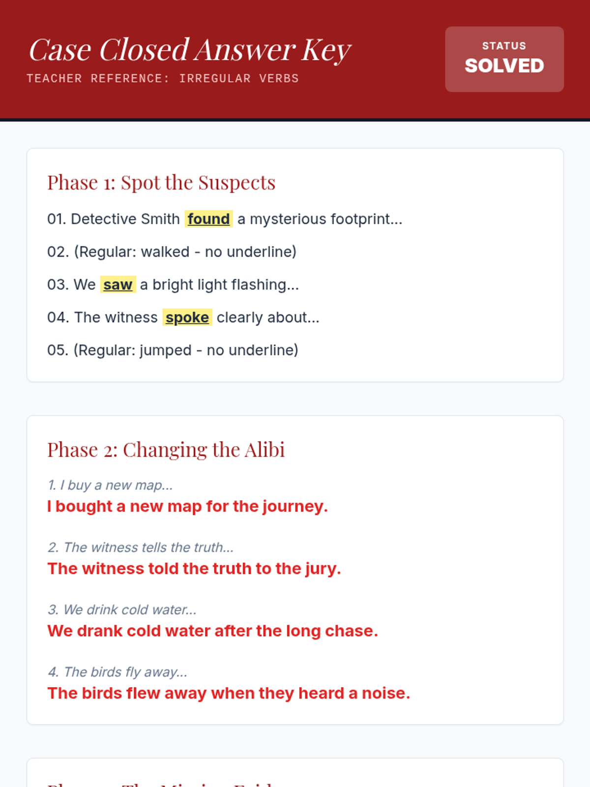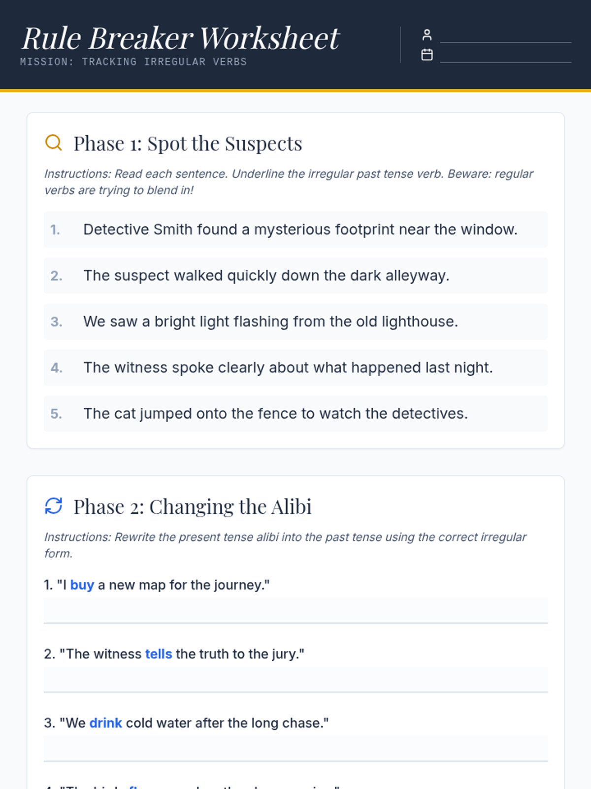 A second-grade friendly detective-themed worksheet for irregular past tense verbs, featuring simplified language, common verbs (went, saw, ate), and clear practice sections. Optimized for 2-page print layout.