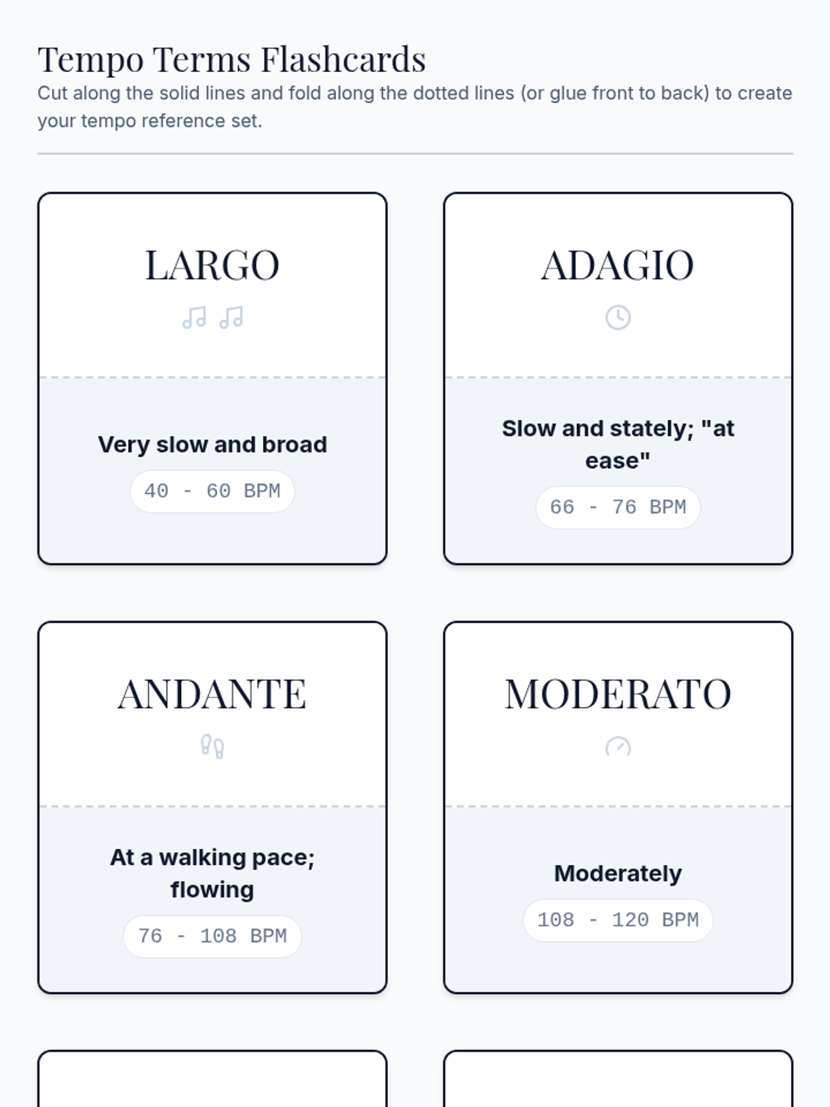 Vocabulary flashcards for musical tempo terms, including Italian names, English definitions, and common BPM ranges. designed for double-sided printing or glue-together assembly.