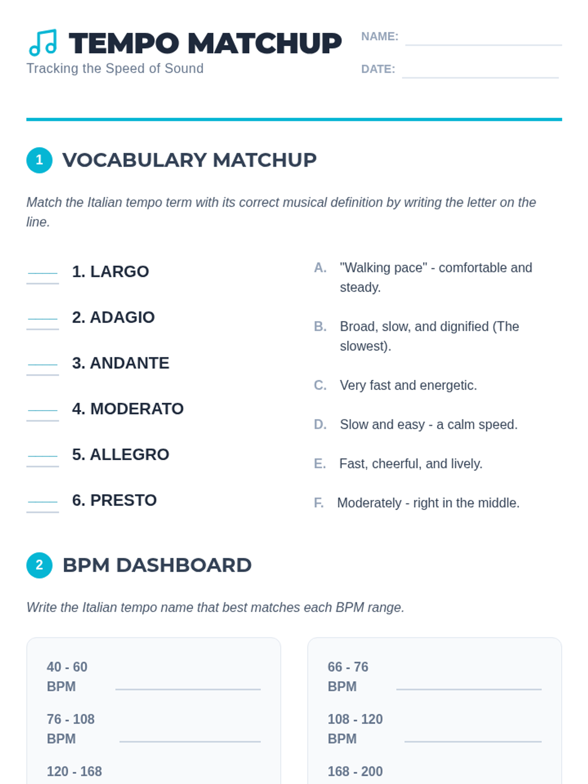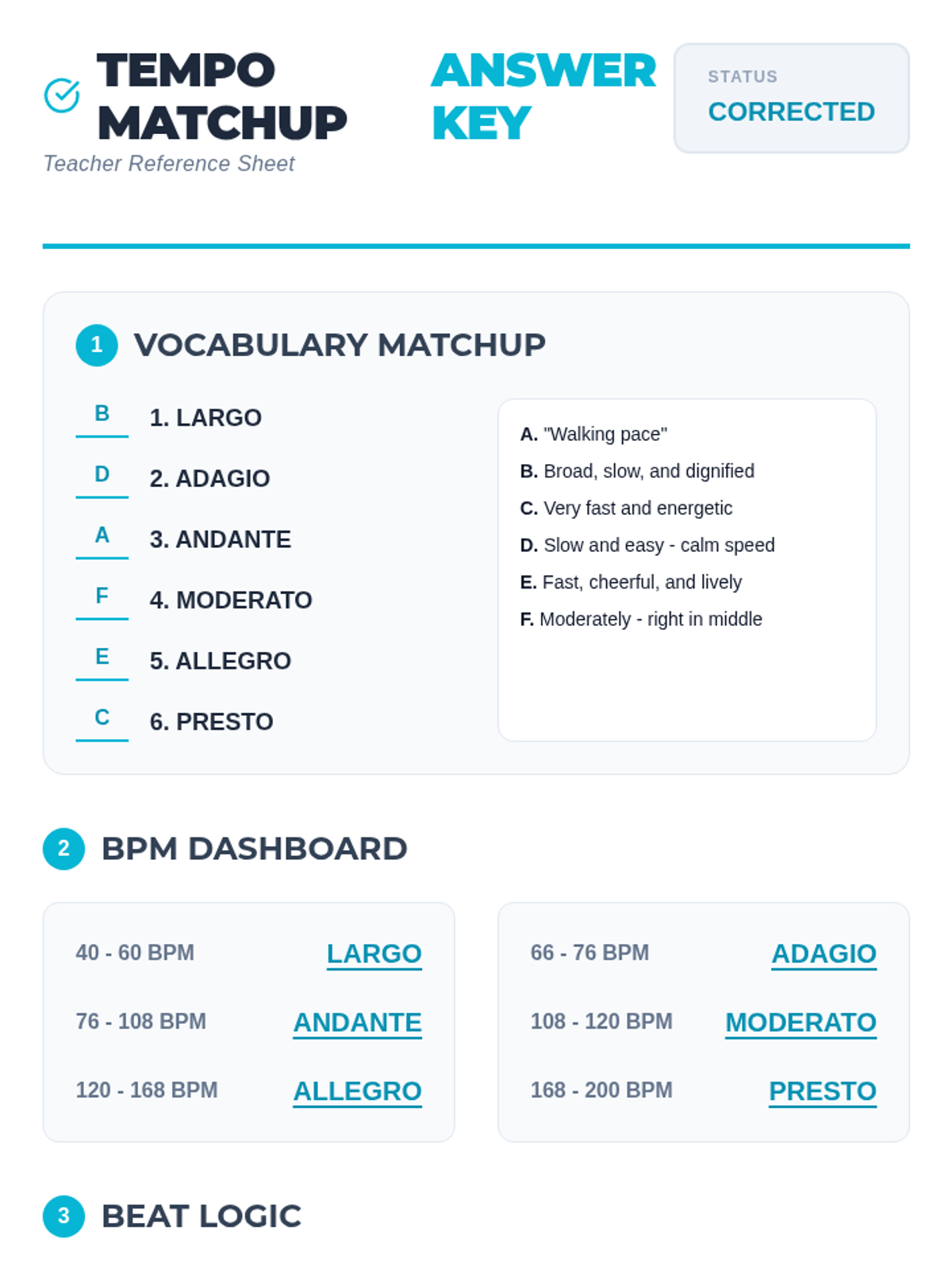 The answer key for the Tempo Matchup Worksheet, providing clear solutions for matching, BPM ranges, and logic questions.