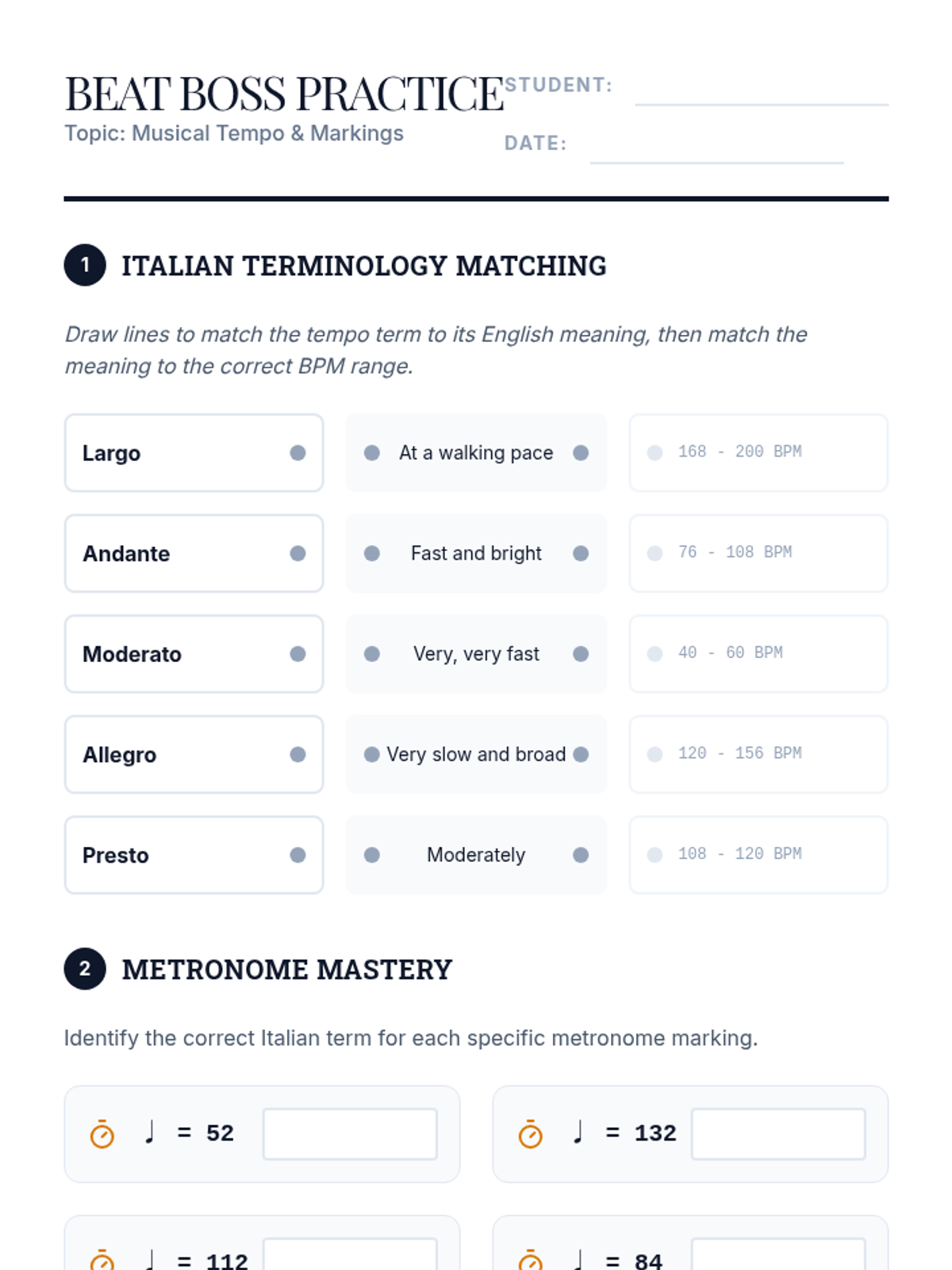 One-page practice worksheet for music tempo, including matching terminology, metronome marking identification, and scenario-based application.