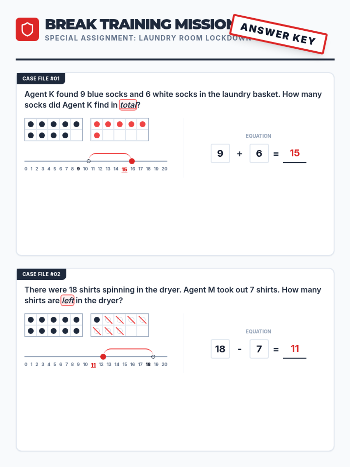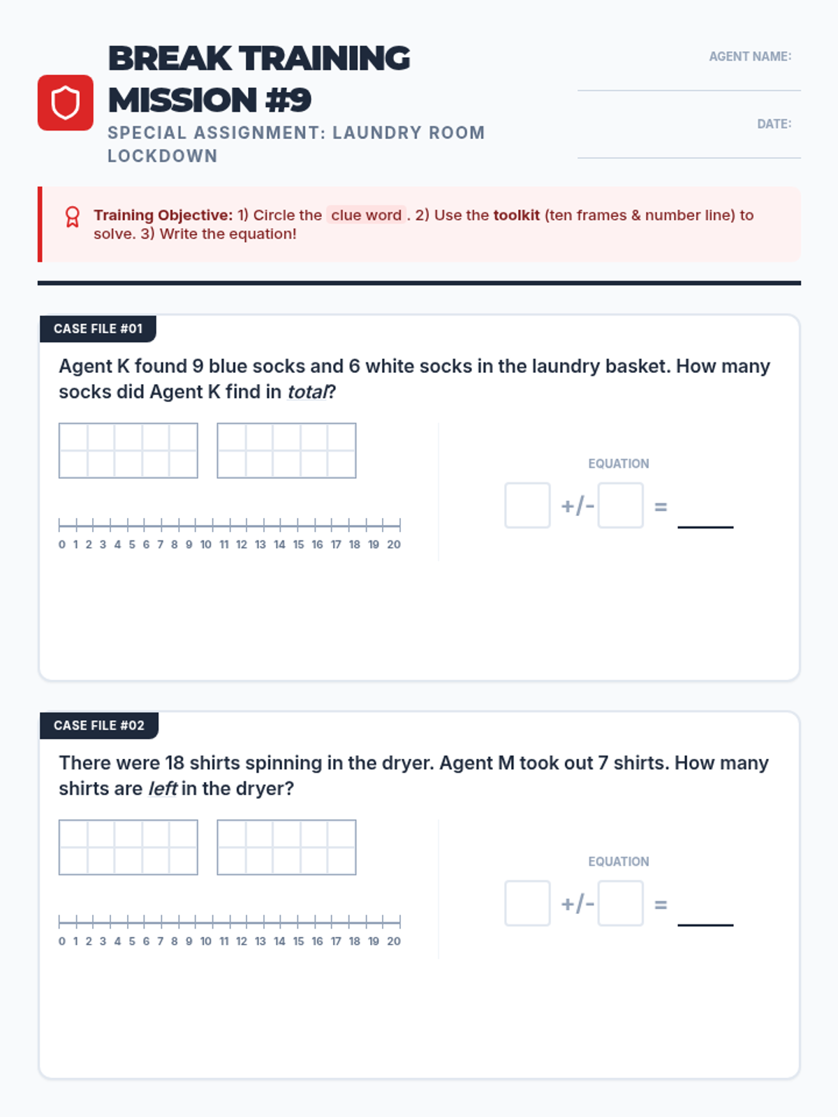 Break Training Worksheet #9 for the Operation Detectives series, themed around a 'Laundry Room Lockdown'. Features 4 word problems with ten frames, number lines, and equation areas for home practice. Revised with improved number lines and clearer stamp.