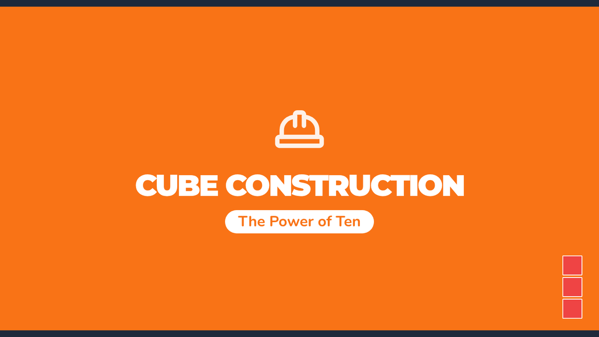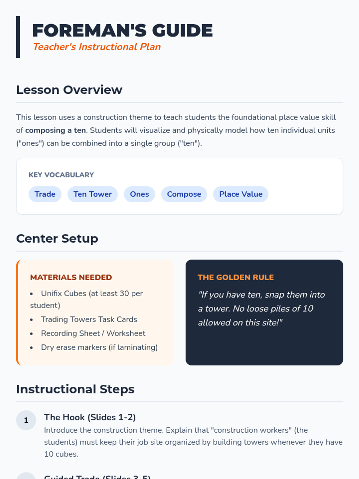 Instructional slides for the "Trading Towers" lesson, featuring a construction theme to explain the concept of trading 10 ones for 1 ten rod using Unifix cubes. Updated visuals for consistency.