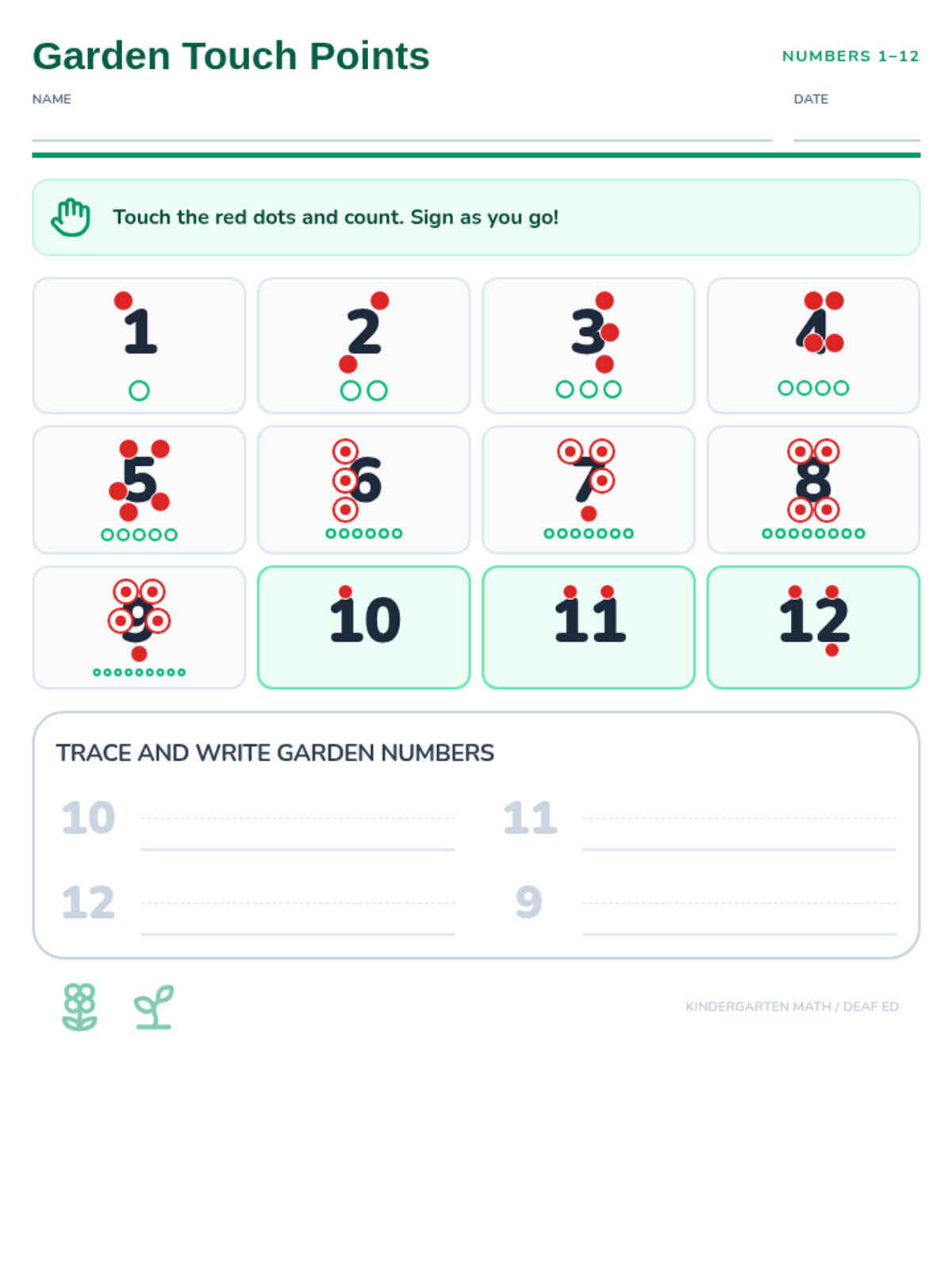 A touch-point worksheet for numbers 1-12, featuring large tactile counting points and space for 1:1 correspondence practice. Designed for deaf learners with high-contrast visuals.