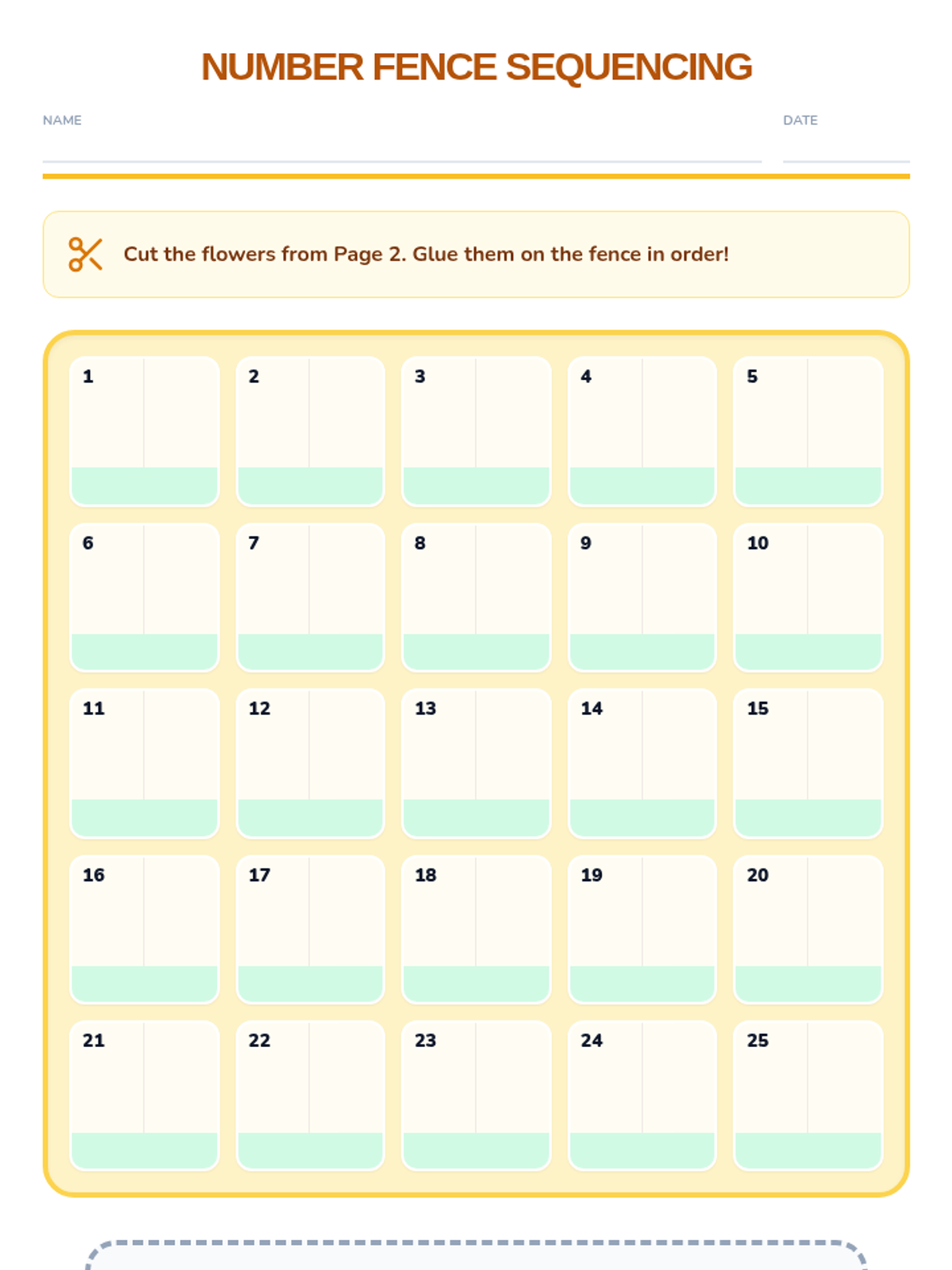 A cut-and-paste activity for sequencing numbers 1-25. Includes a target 'fence' grid and a separate page of number tiles to cut out, promoting fine motor skills and numerical order.