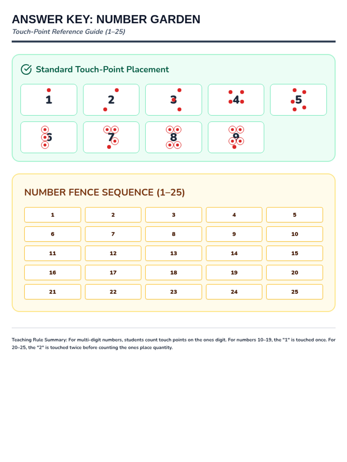 An answer key for the Garden Counting lesson, providing quick visual references for touch-point placement and correct sequencing for numbers 1-25.