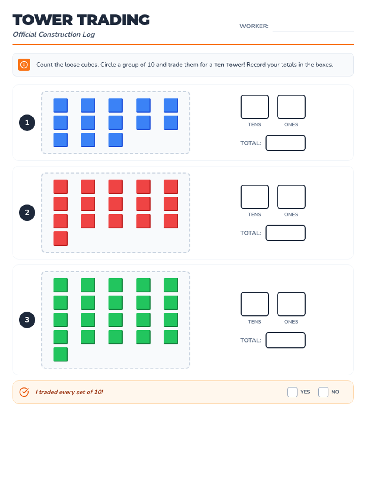 Individual practice worksheet for counting cubes, trading sets of 10 for ten-rods, and recording the final tens and ones. Fixed page break and layout issues.