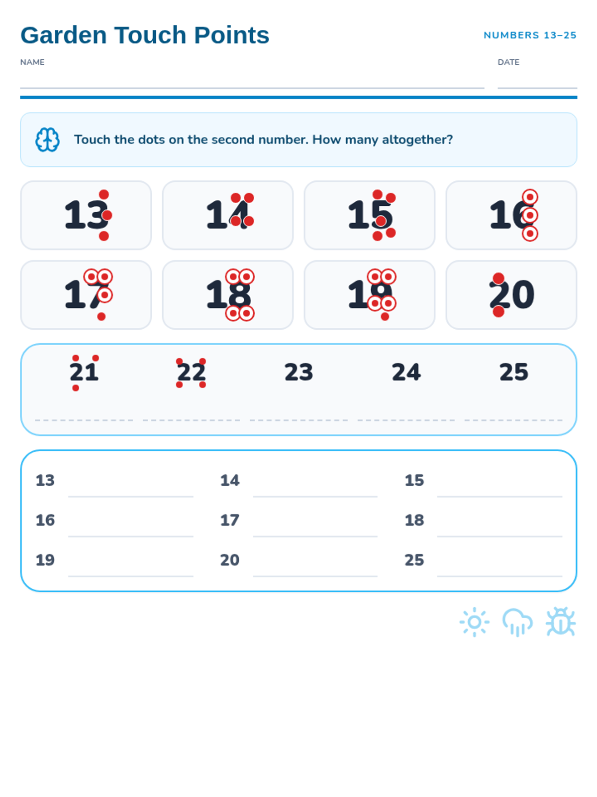 A touch-point worksheet for numbers 13-25, focusing on teen number structures and writing practice. Features clear visual cues and space for independent student work.