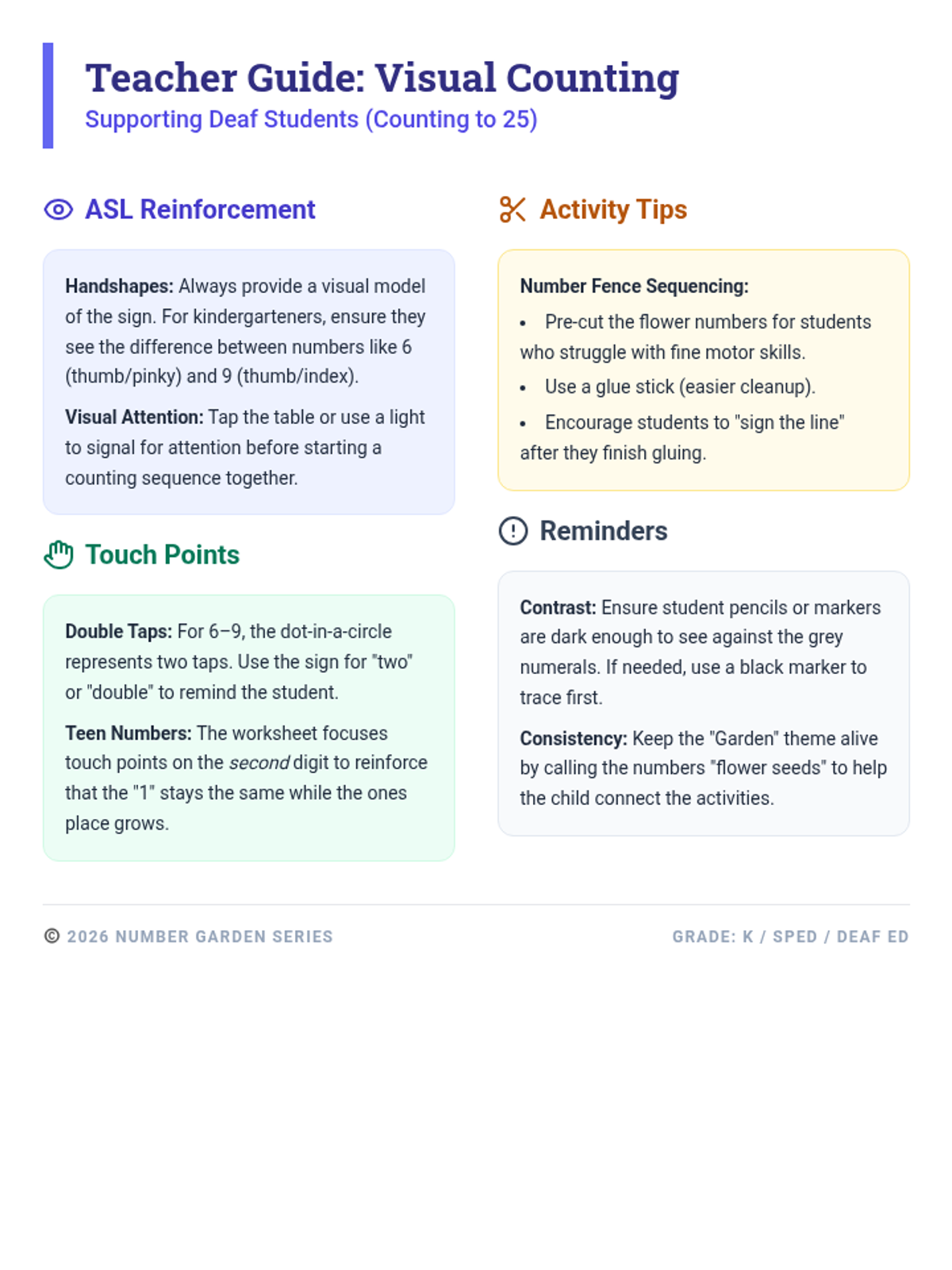 A teacher's guide for implementing touch-point counting and sequencing with deaf students. Includes strategies for ASL integration, tactile feedback, and overcoming common misconceptions with teen numbers.