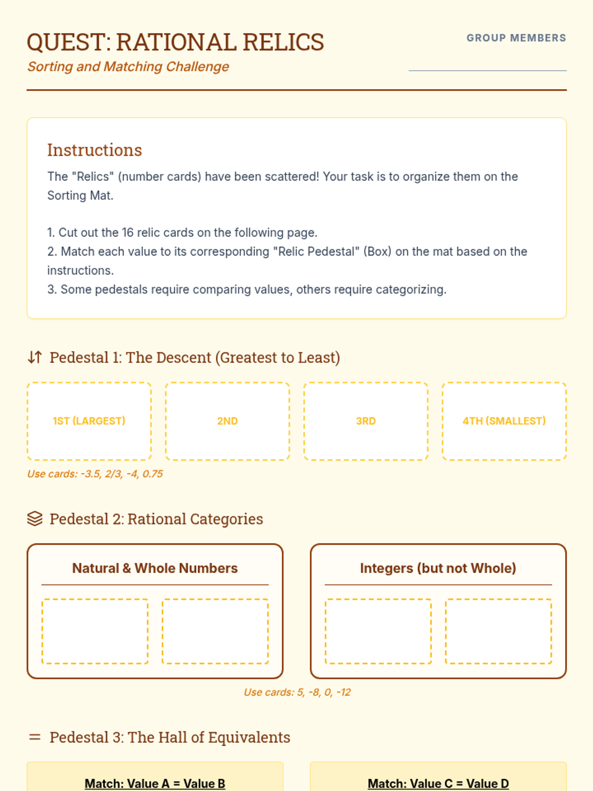 A sorting mat for the Rational Relics activity. Students organize integer and rational number cards based on value, category, and equivalence.