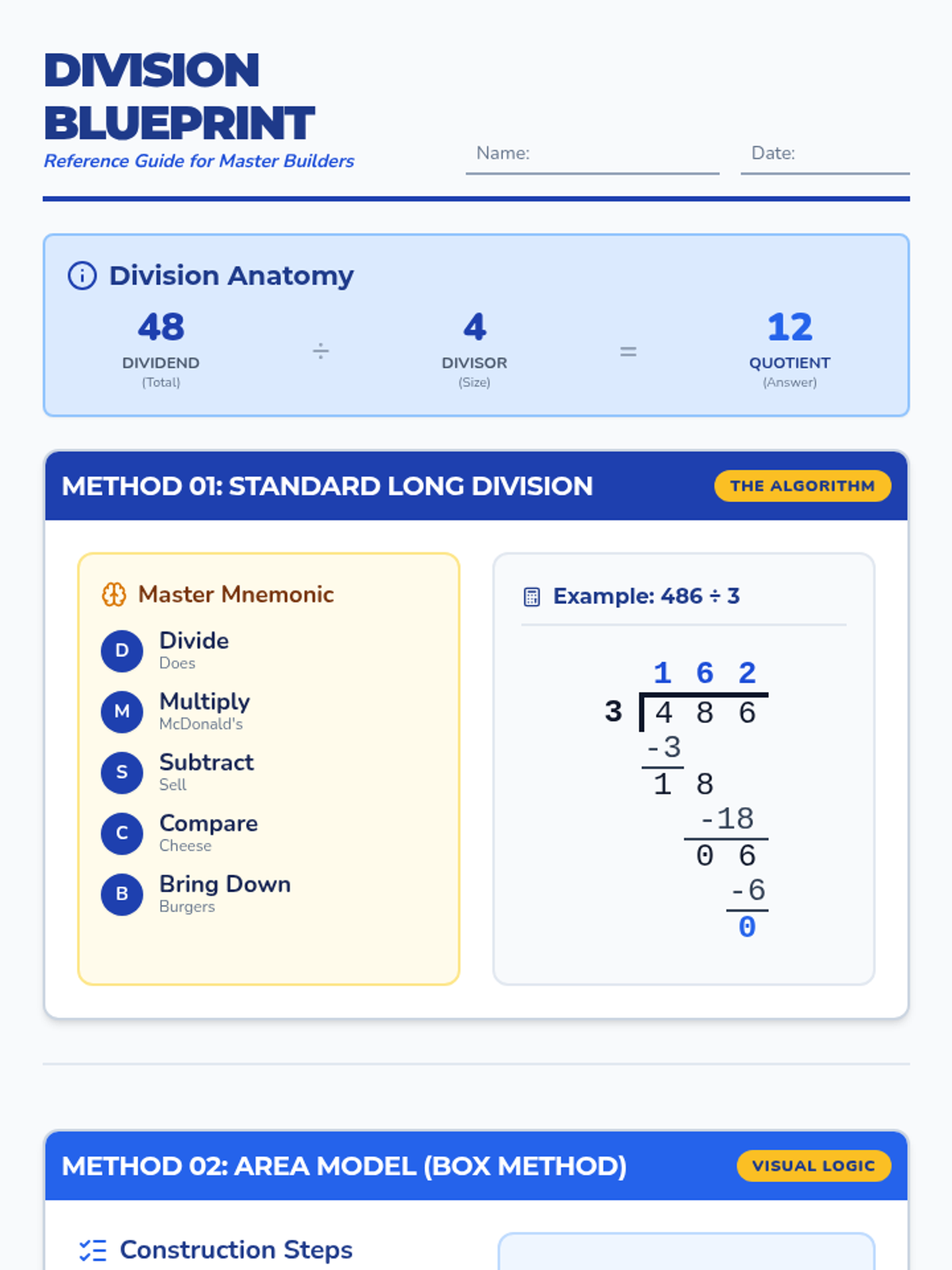 A revised comprehensive division reference sheet featuring perfectly aligned standard long division and the area model. Includes refined mnemonics, step-by-step checklists, and clear place-value visual guides across a clean 2-page layout.