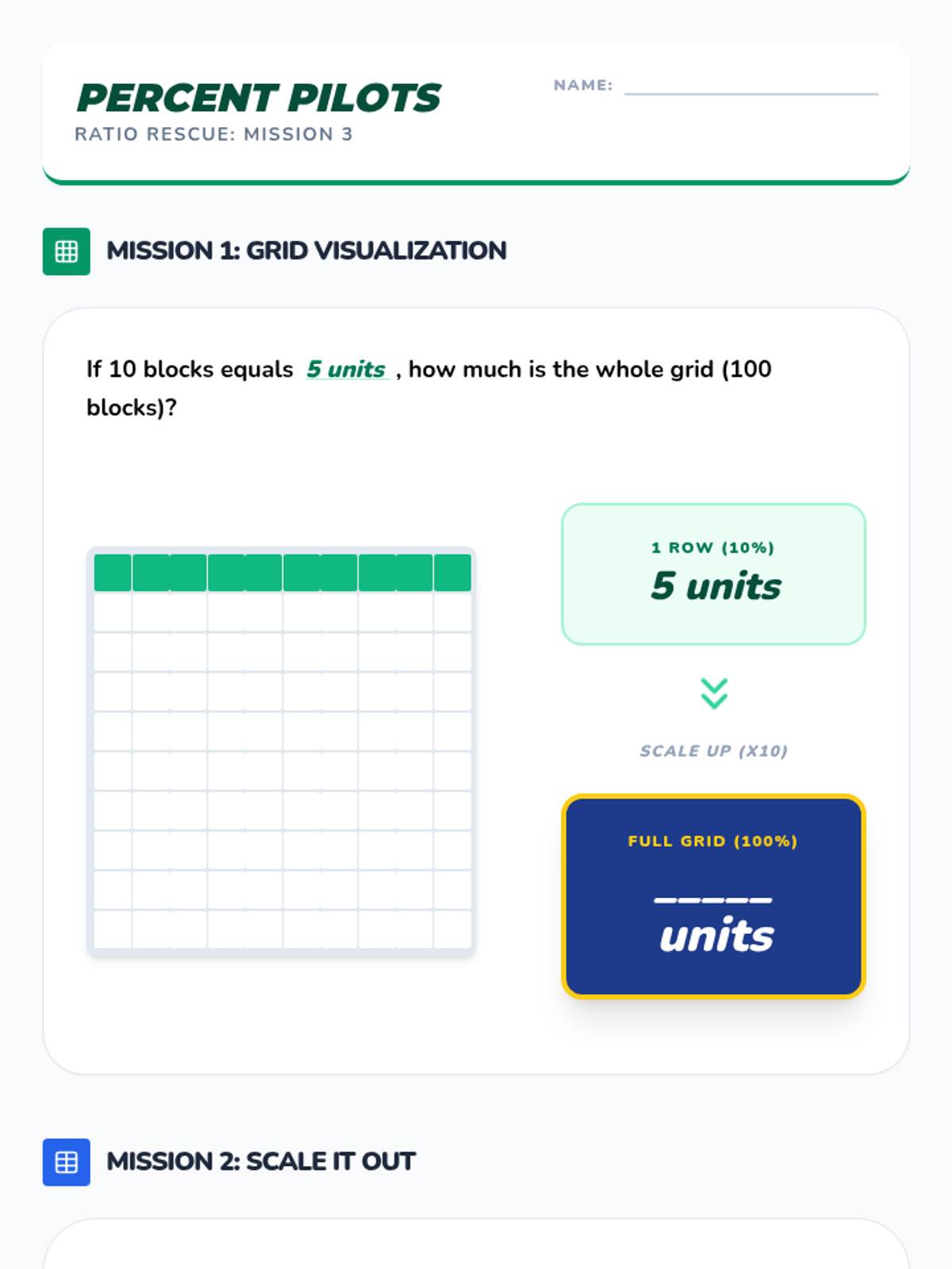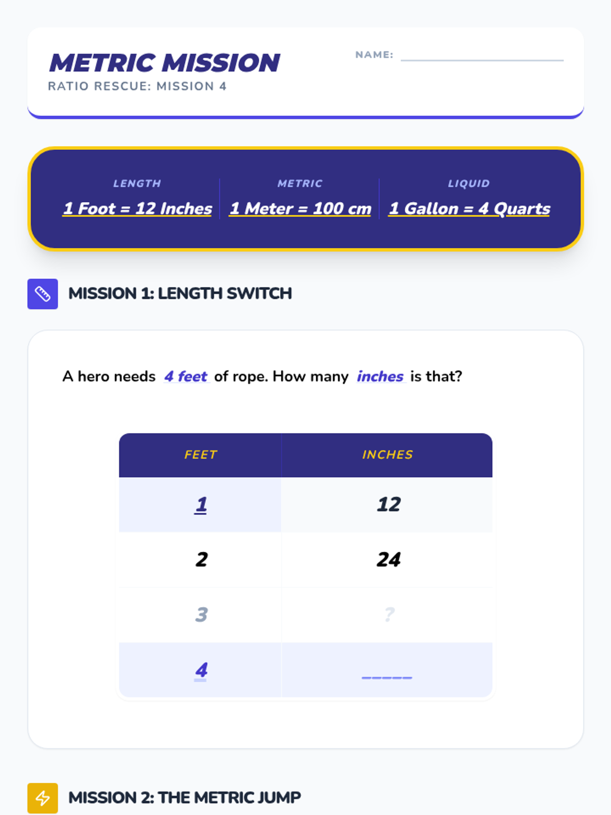 A scaffolded student worksheet for Day 4 of the Ratio Rescue unit. Revised to prevent layout splits, provide light backgrounds for student work, and increase calculation space.
