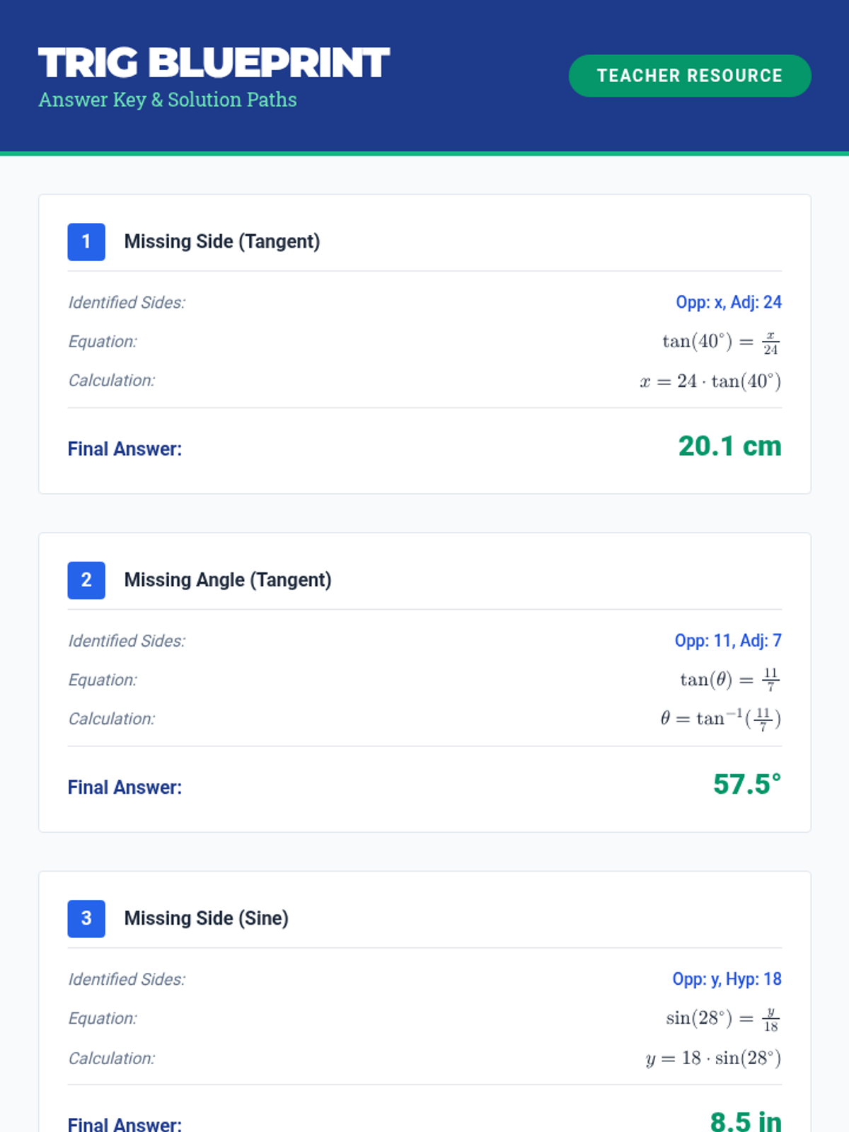 A teacher's answer key for the Trig Blueprint Worksheet, providing full step-by-step solution paths and teaching tips for each problem. Updated to include Cosine and corrected for page-flow issues.