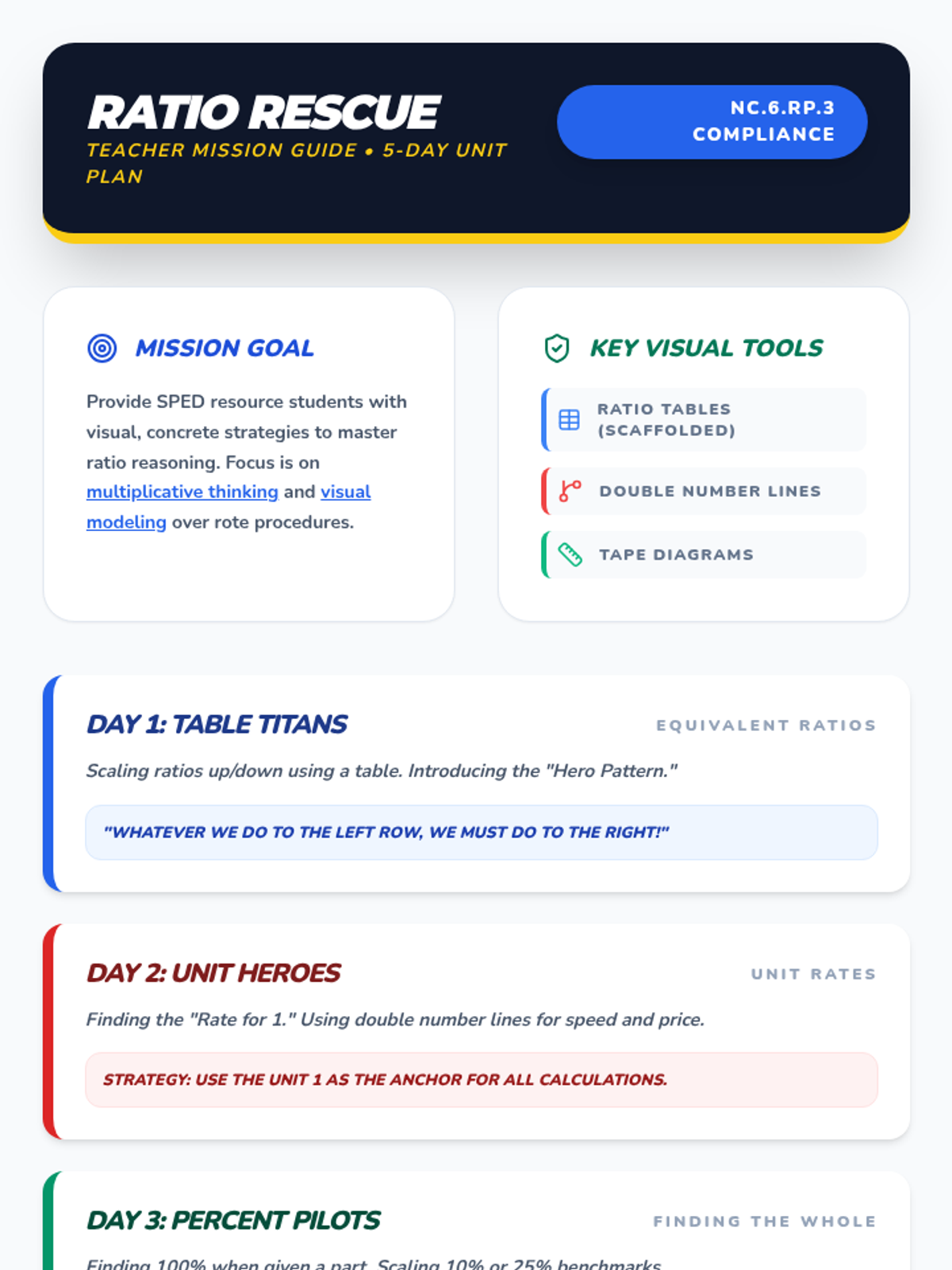 A comprehensive teacher guide for the 5-day Ratio Rescue unit. Revised to include the missing 5th day, fix minor syntax errors, and improve text legibility for teachers.