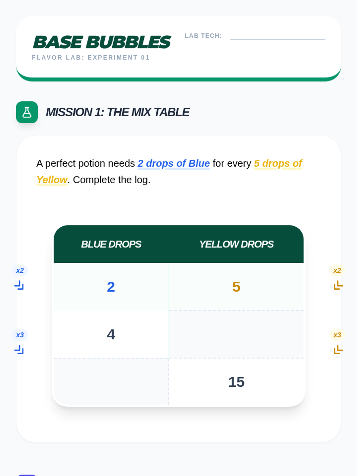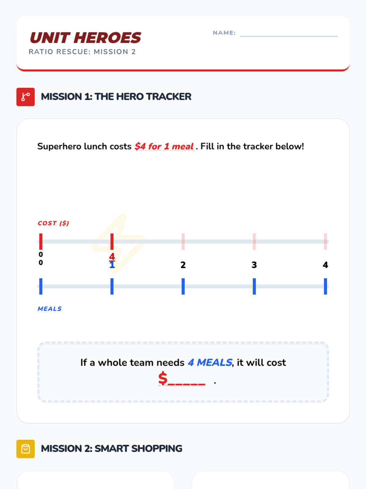 A scaffolded student worksheet for Day 2 of the Ratio Rescue unit. Revised to fix layout splits, improve text contrast for choices, and provide a light background for student work areas.