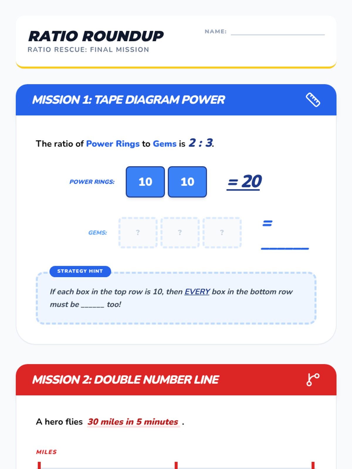 A scaffolded student worksheet for Day 1 of the Ratio Rescue unit. Revised to prevent problem splitting across pages and to align visual scaffolding with ratio table rows.