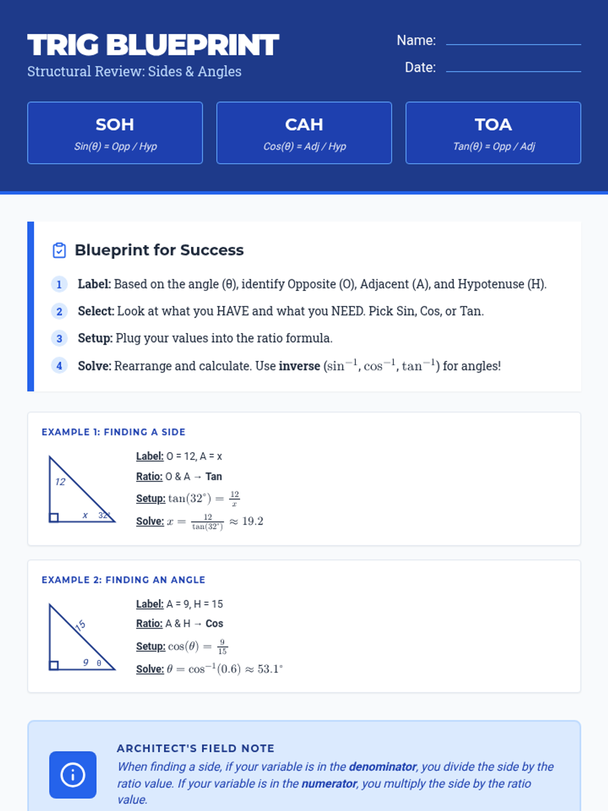 A student-facing trigonometry review sheet styled as an architectural blueprint, featuring a step-by-step checklist, worked examples for sides and angles, and four practice problems with dedicated workspace. Updated for better page flow and to include all three trig ratios.