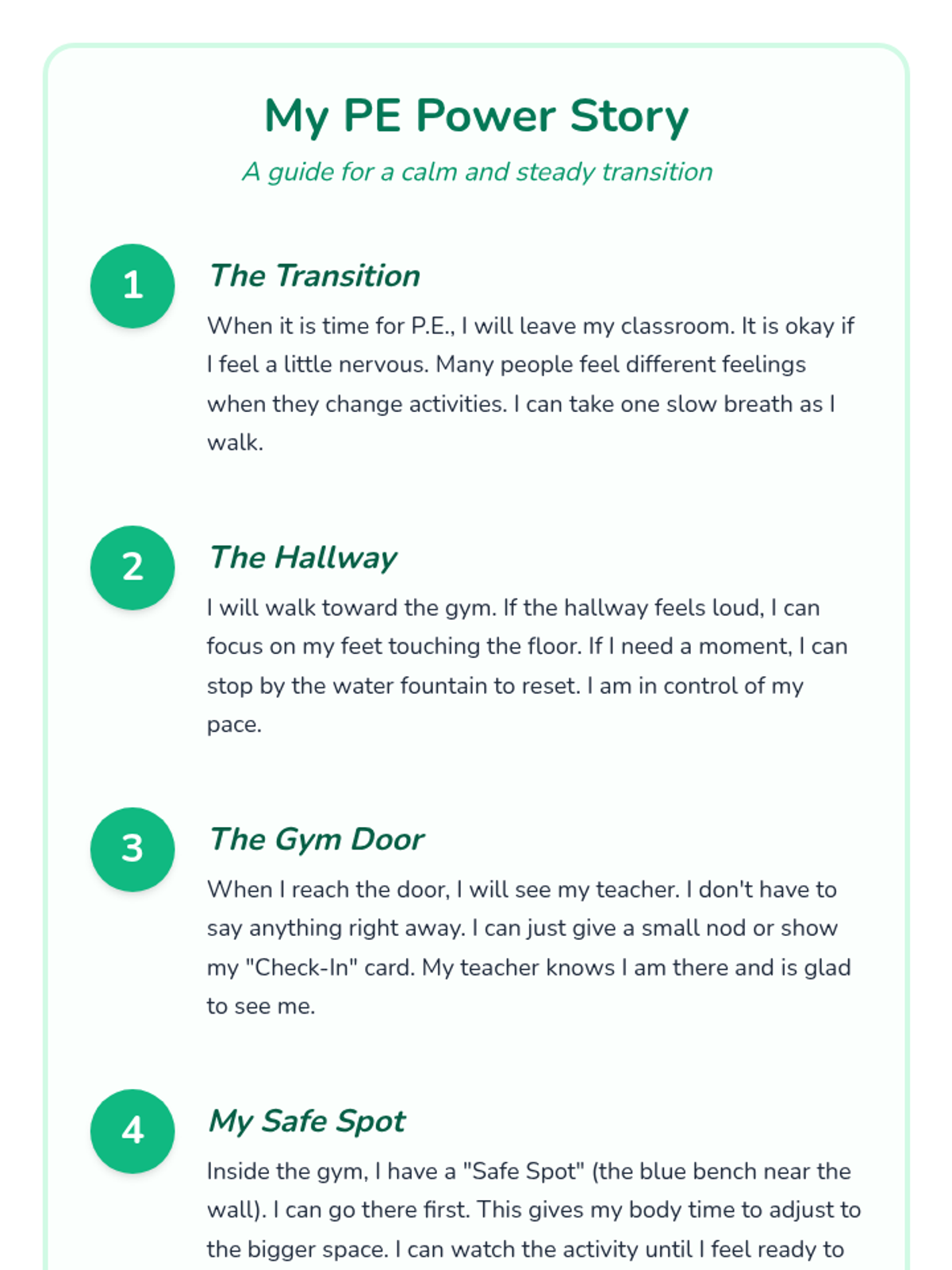 A calming social narrative document that walks the student through the step-by-step process of transitioning into the P.E. environment, emphasizing self-control and safety.