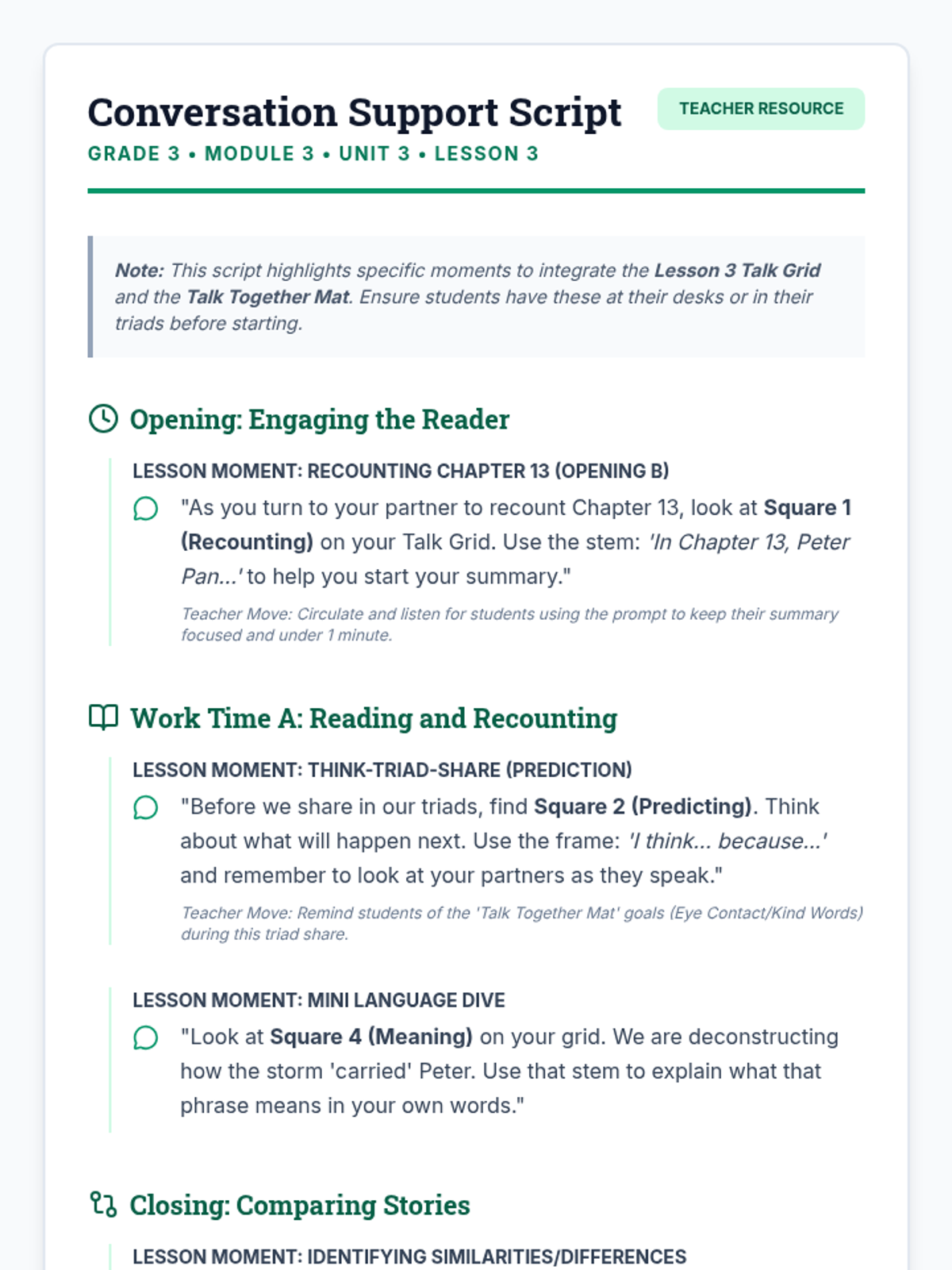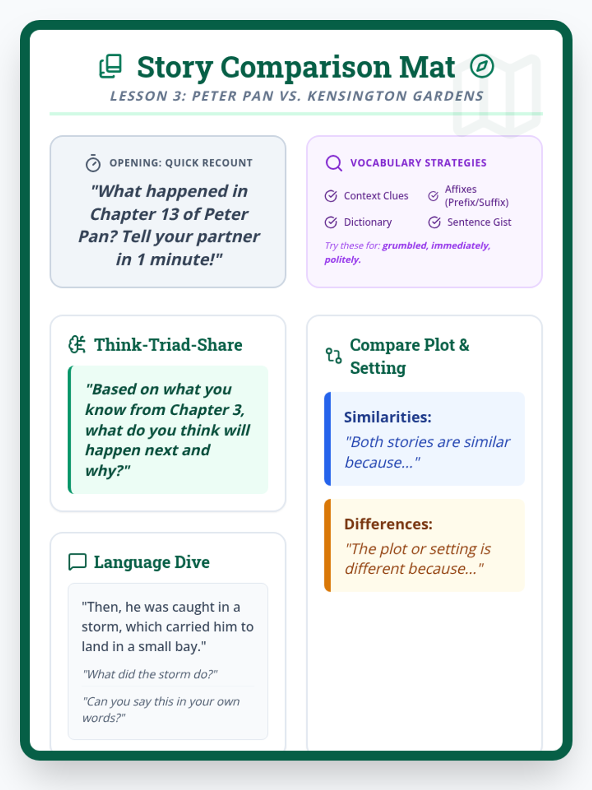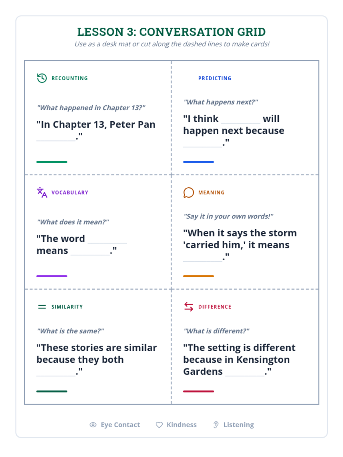 A simple, grid-based conversation tool for Lesson 3. It features 6 squares with sentence stems specifically for recounting, predicting, vocabulary, language dives, and story comparisons. Designed to be used as a desk mat or cut into cards.