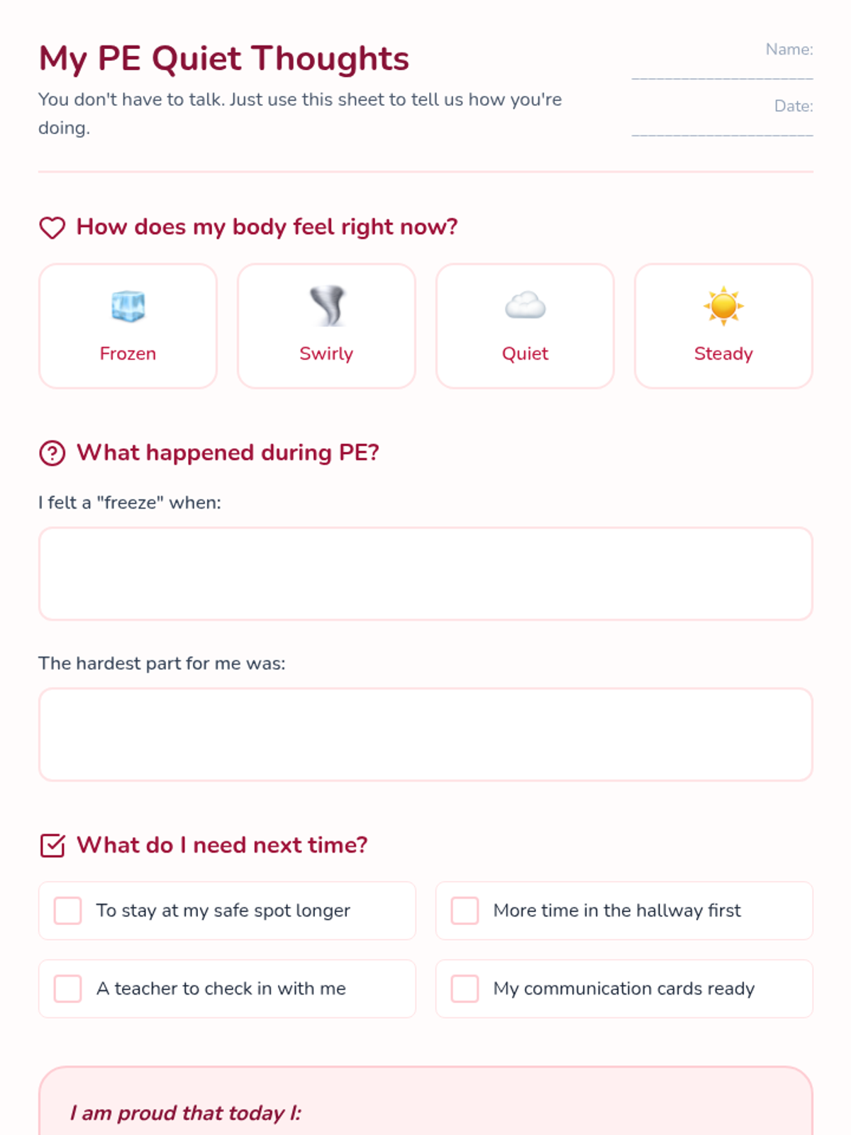 A fill-in-the-blank 'Think Sheet' designed for non-verbal expression after a difficult P.E. transition, focusing on identifying feelings and planning for the next class.