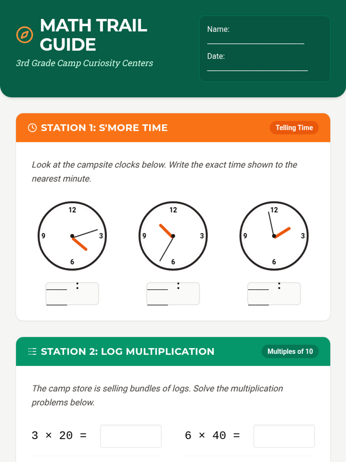 A math activity log for 3rd-grade students featuring four camping-themed centers: telling time, multiplying by tens, one-step word problems, and shape attributes. Includes expanded workspace for word problems and improved layout for clock readings.