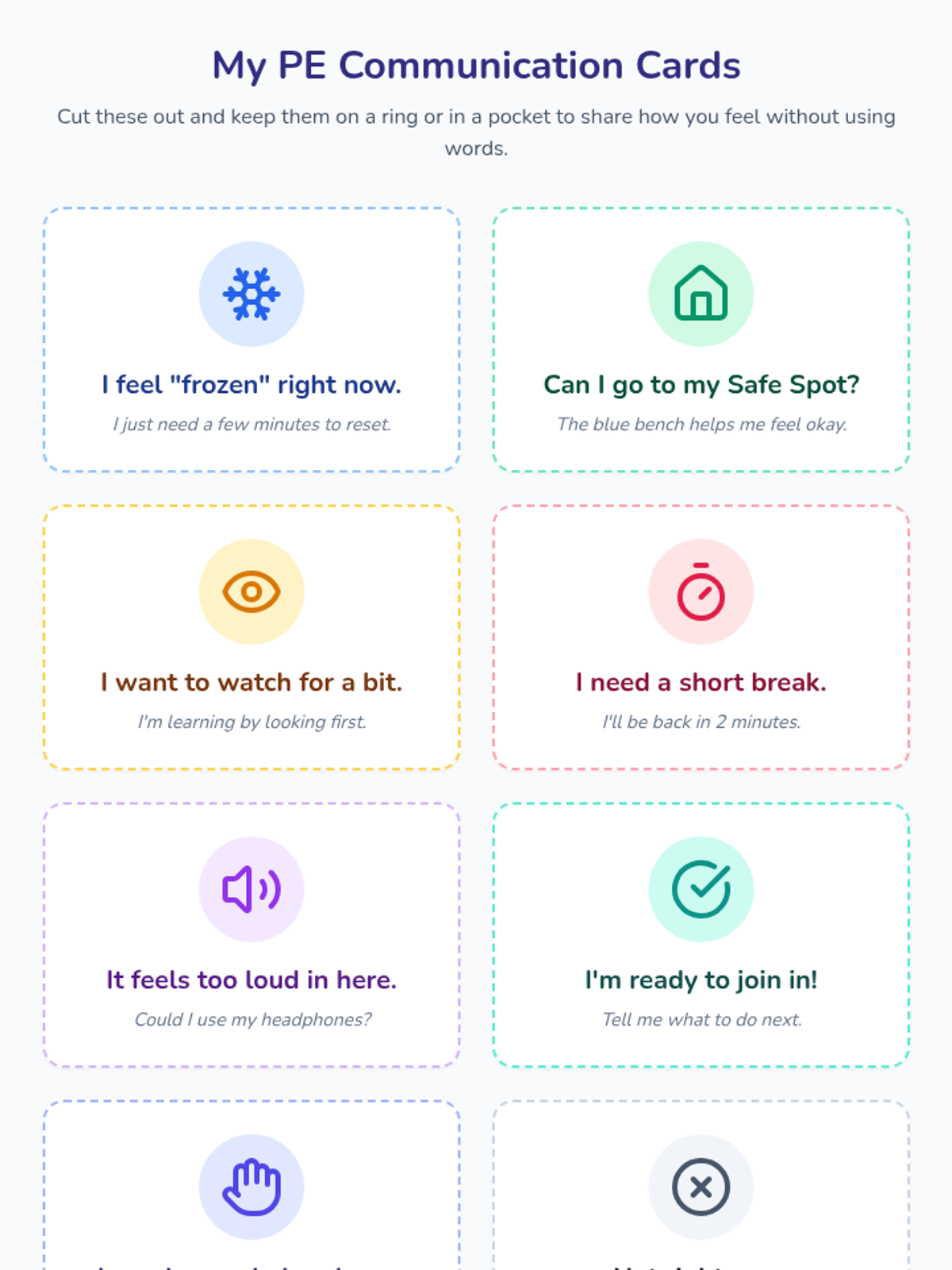 A set of 8 printable communication cards with icons and simple text to help the student express needs and feelings non-verbally during P.E. transitions.
