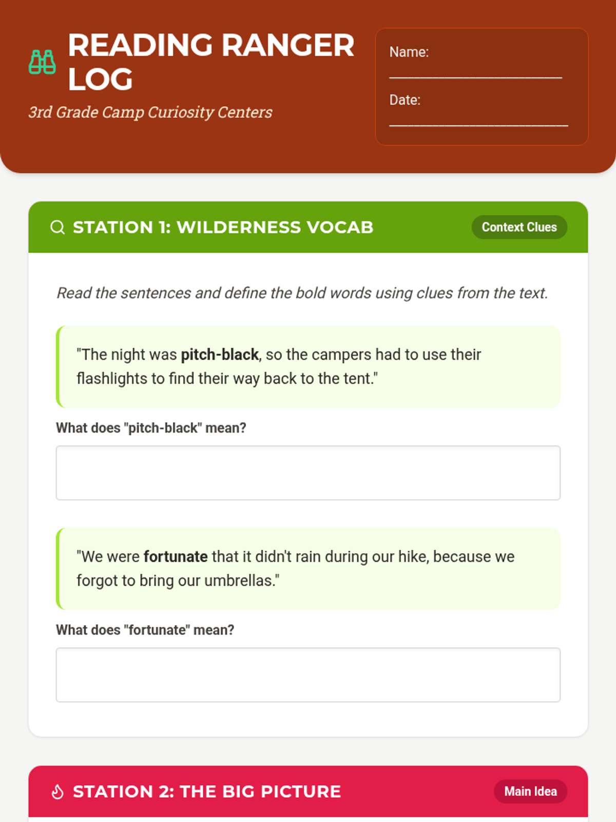A reading activity log for 3rd-grade students featuring four camping-themed centers. Provides expanded writing space for nouns/verbs sorting and improved layout for context clues and point of view activities.