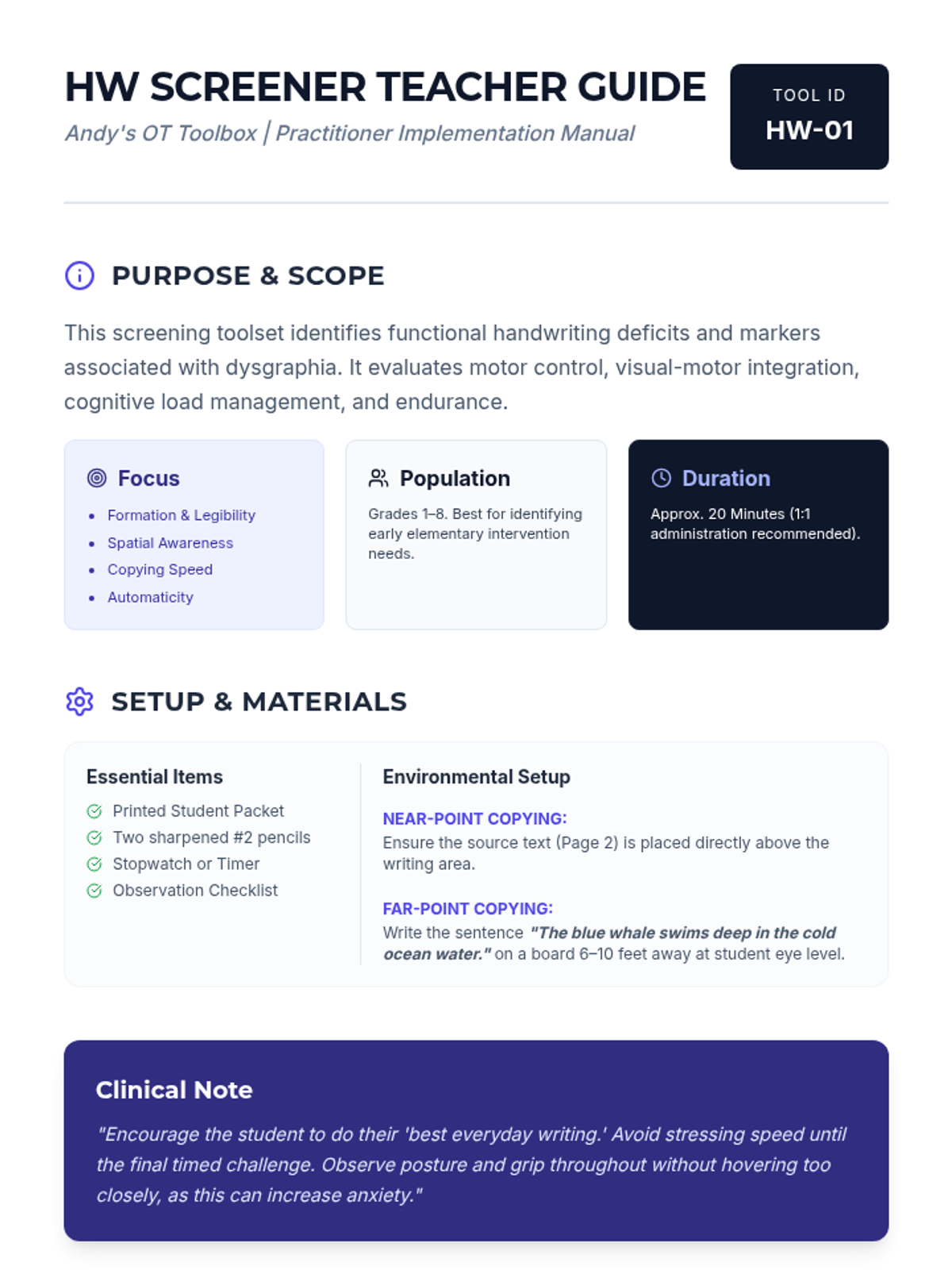 A three-page comprehensive teacher guide for administering the HW Screener. Includes setup instructions for near-point and far-point copying, administration scripts for all five student tasks, observation tips, and result interpretation guidance. Each page is strictly fixed to 960px height to prevent boundary crossing. Part of Andy's OT Toolbox.