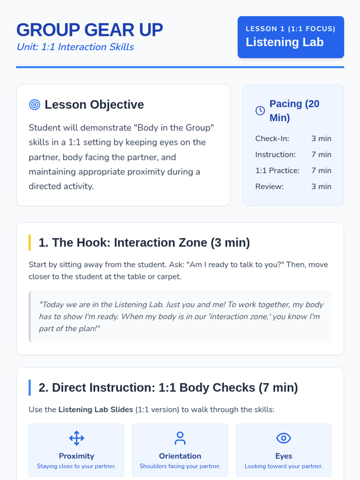 A 20-minute teacher guide for the Listening Lab lesson, detailing instructional steps, pacing, and activity prompts for teaching Whole Body Listening.