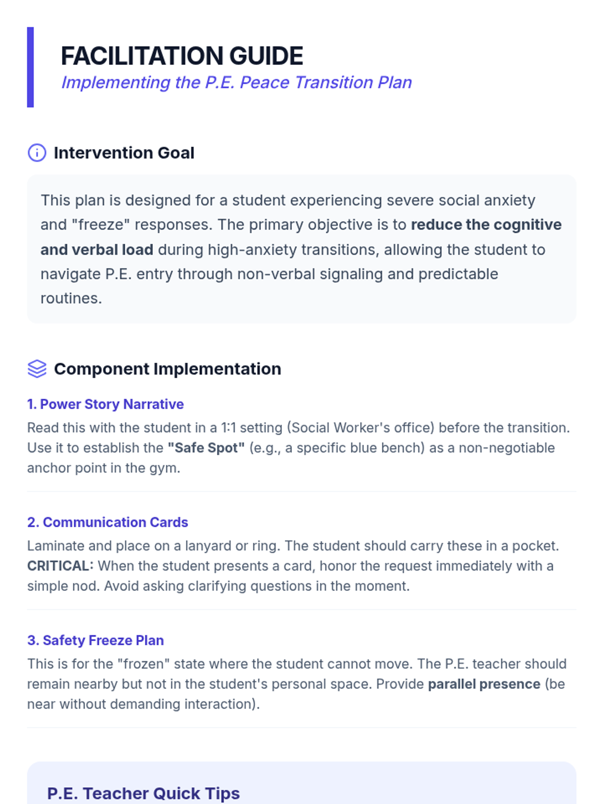 A teacher-facing instructional guide that provides specific strategies for P.E. staff and social workers on how to implement the non-verbal transition tools and handle 'freeze' responses effectively.