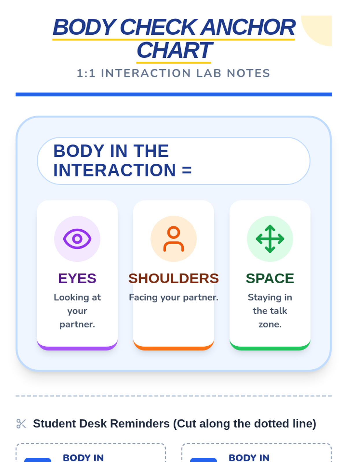 A high-contrast visual anchor chart detailing the components of 'Body in the Group' (Eyes, Shoulders, Space) adjusted for 1:1 interactions.