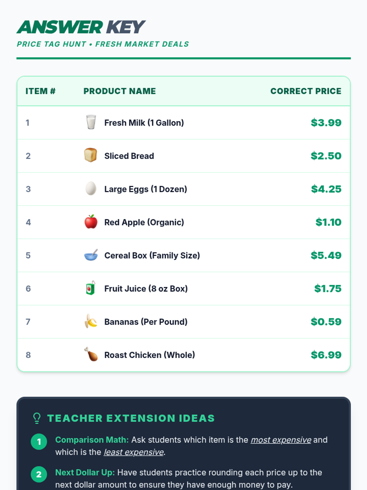 An answer key for the Price Tag Hunt worksheet, including correct prices and extension activities for teachers.