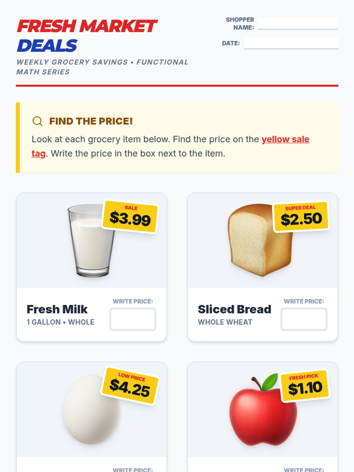 A 2-page functional math worksheet featuring 8 common grocery items with realistic price tags for students to identify and record.