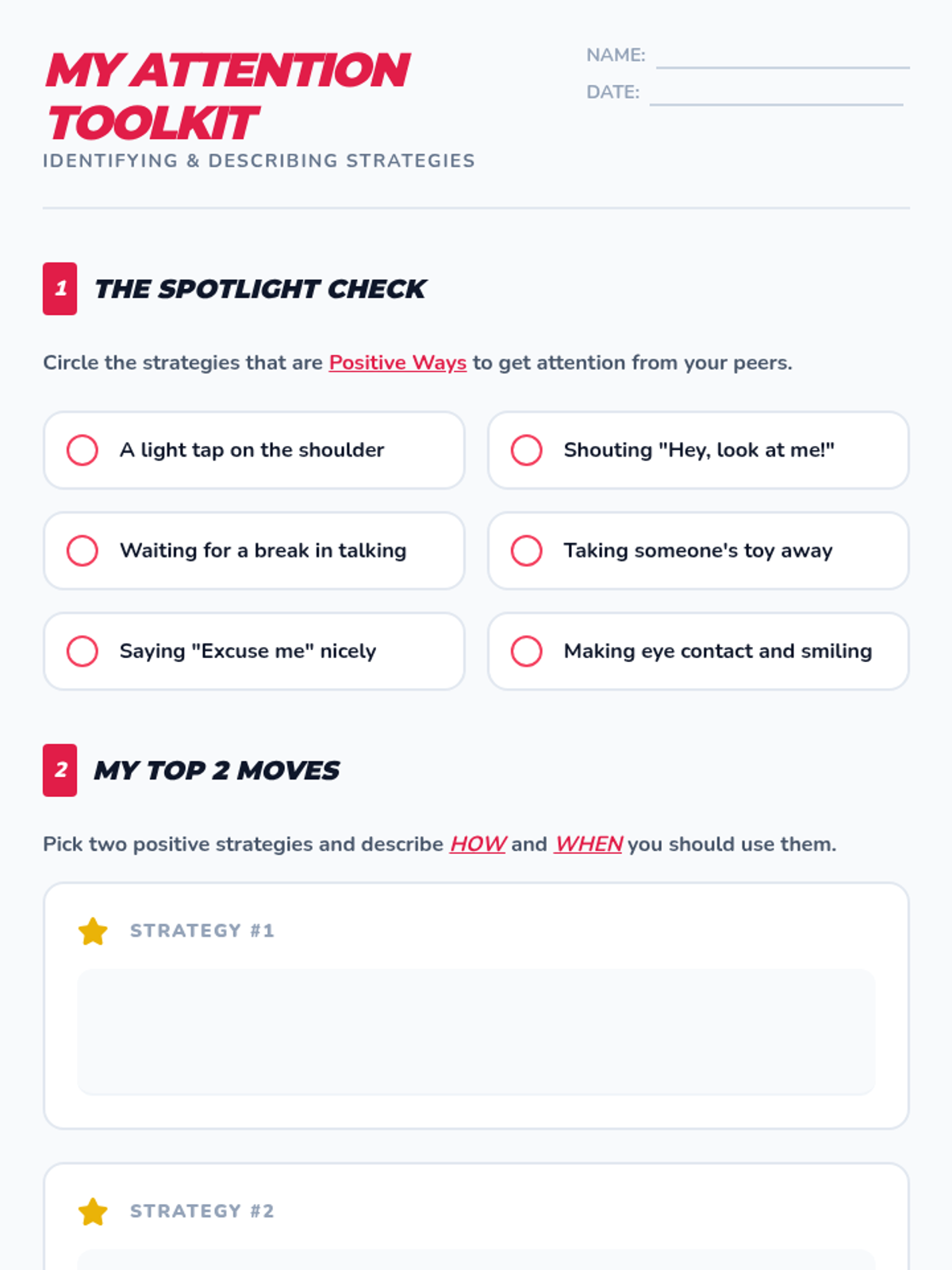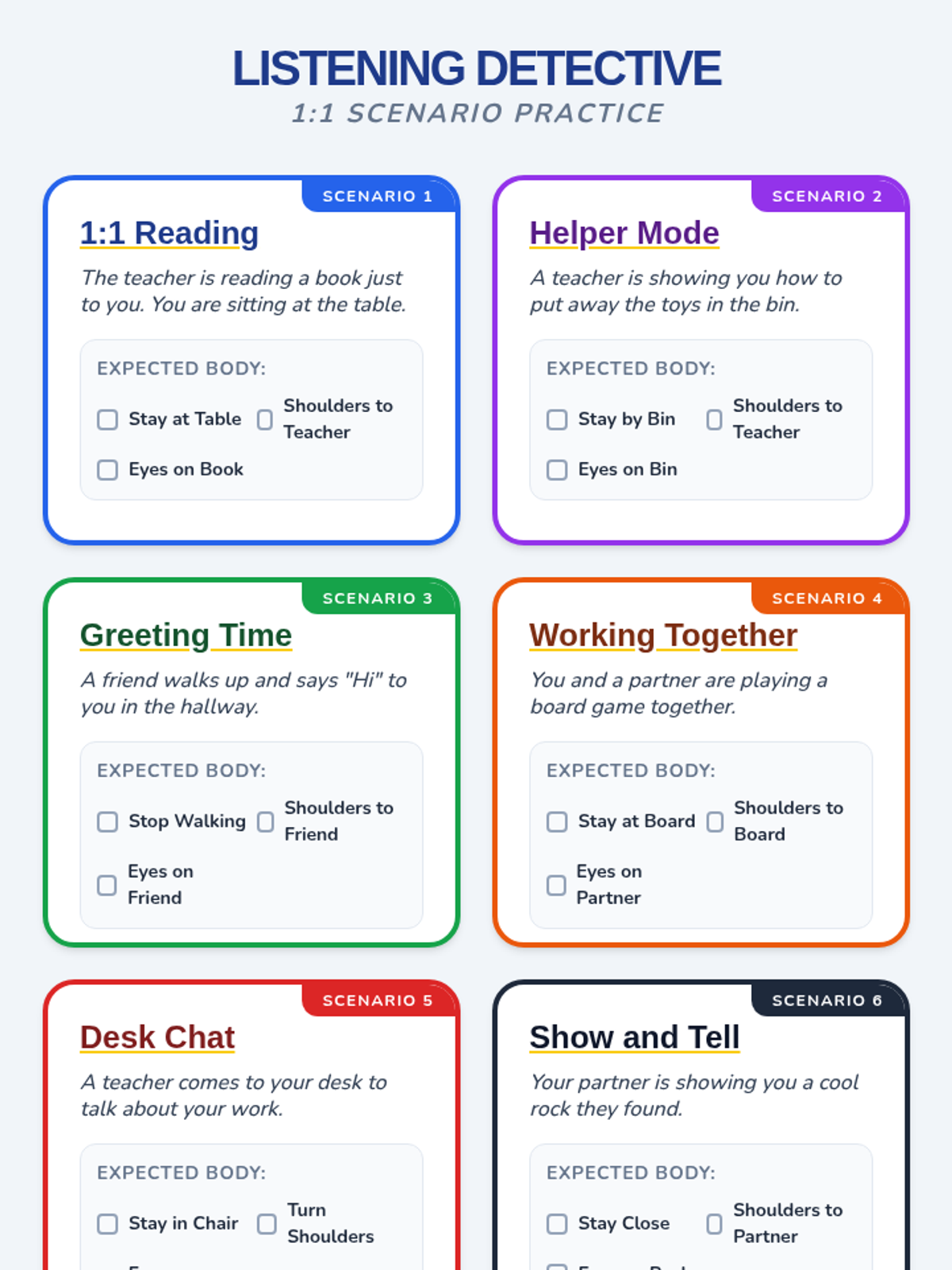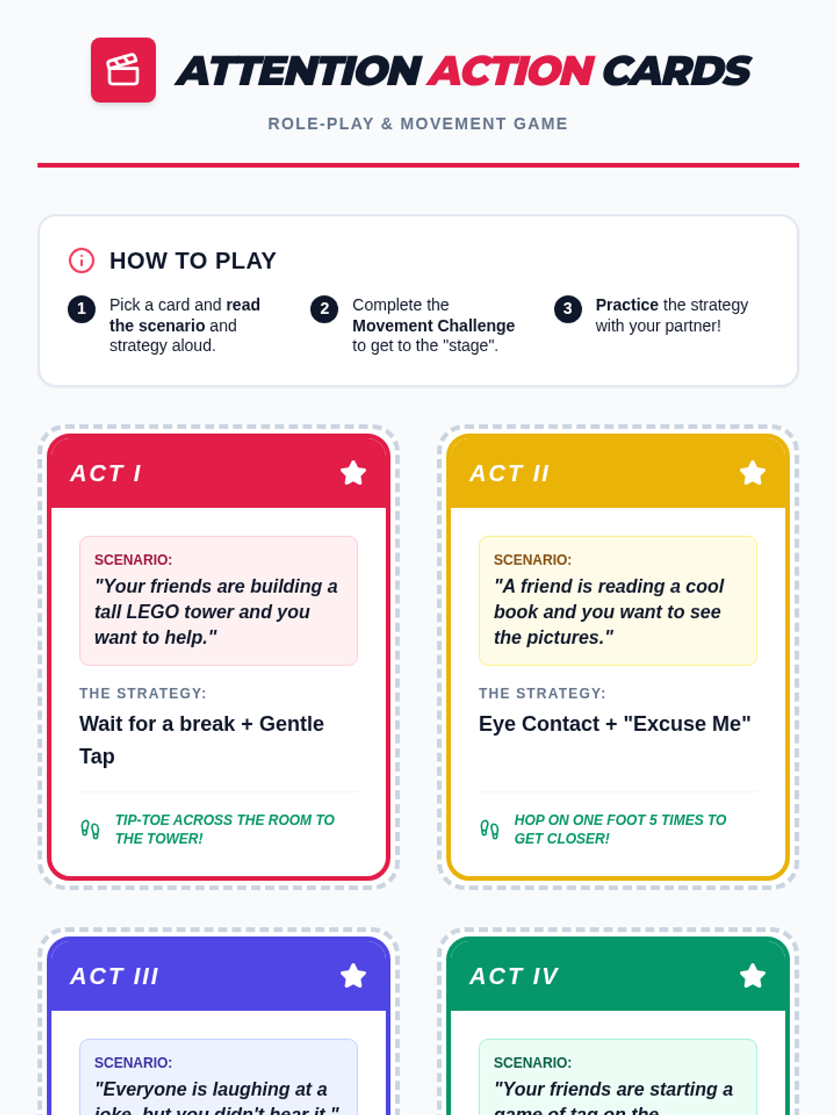 A set of 6 printable role-play cards designed to facilitate practice of social attention strategies. Each card features a scenario, a specific strategy, and a 'Movement Challenge' to engage students physically while they practice social interactions.