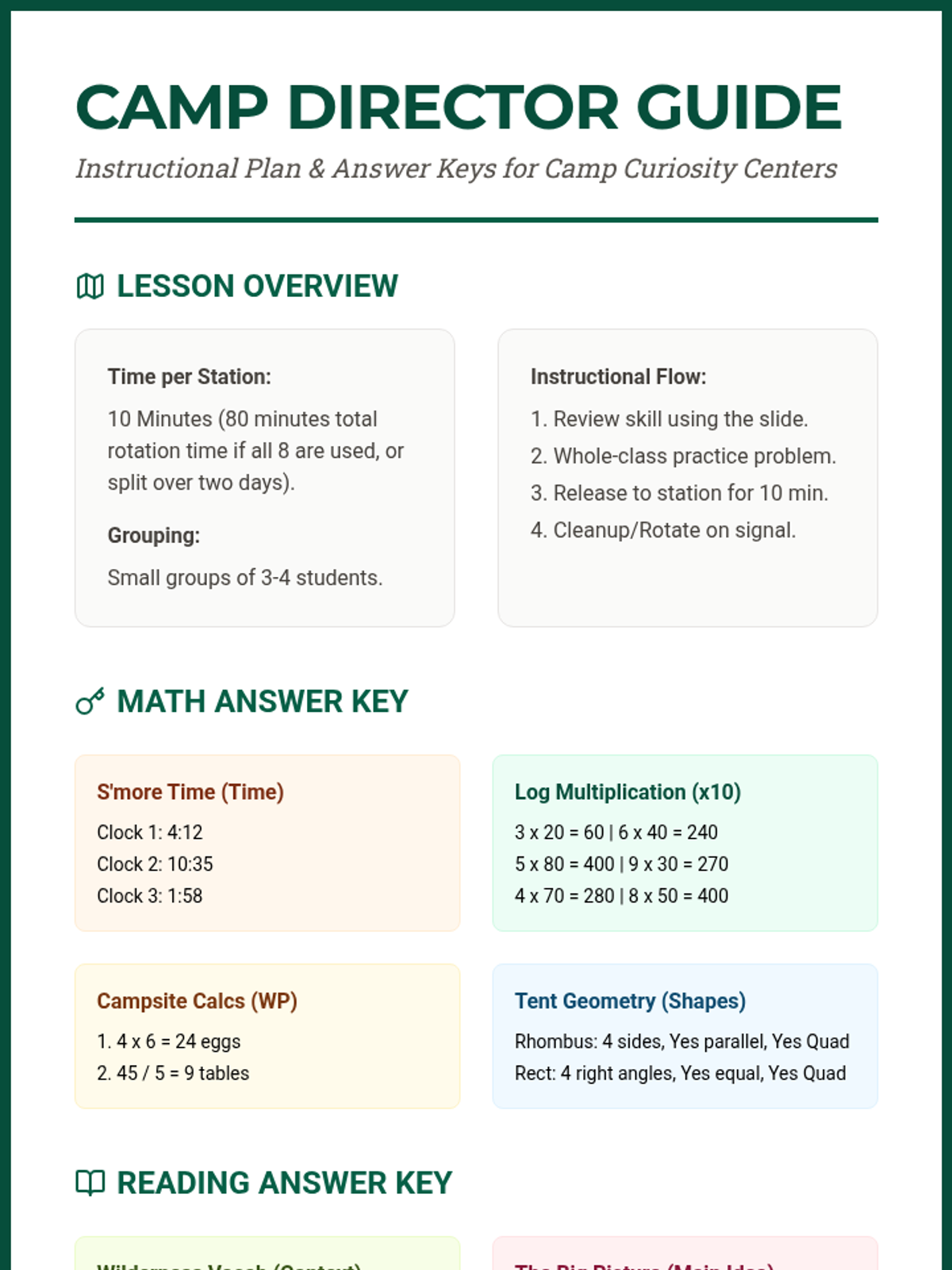 Teacher guide for the Camp Curiosity centers lesson. Includes lesson overview, instructional flow, complete answer keys for both math and reading activities, and classroom management tips.