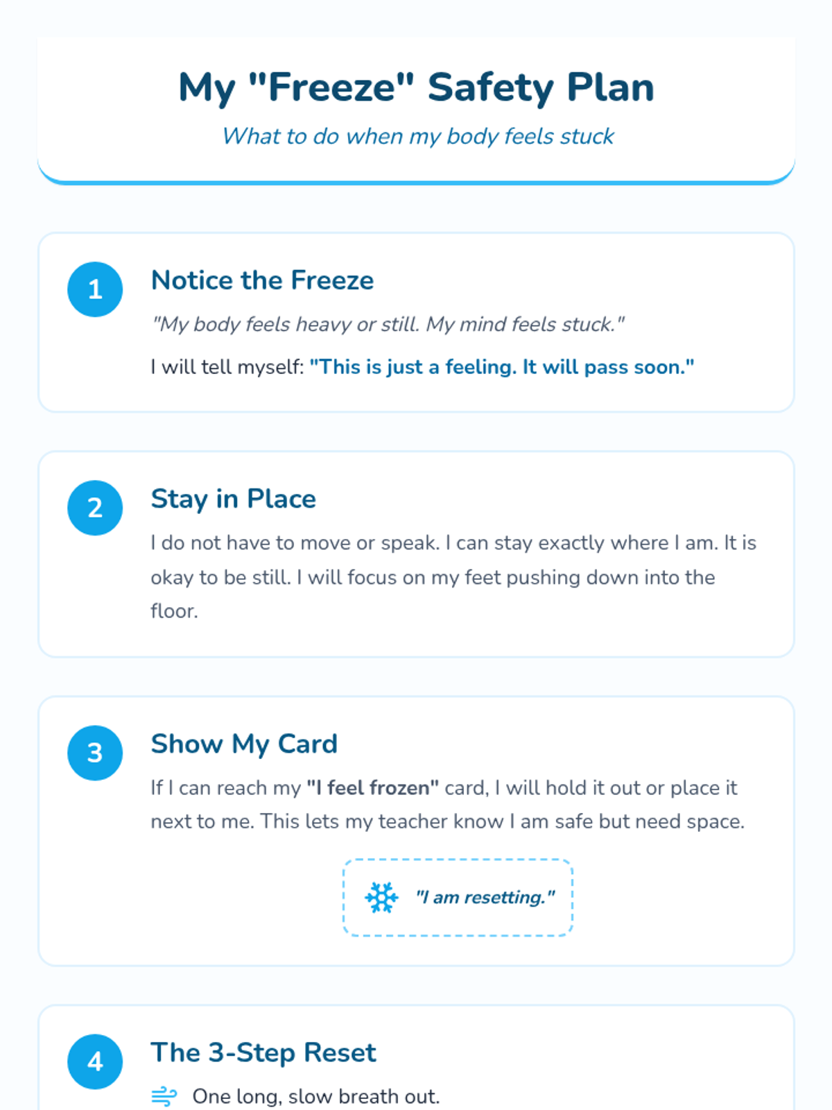 A structured safety plan document for the student to use when experiencing a 'freeze' response, providing clear, manageable steps for grounding and self-regulation.