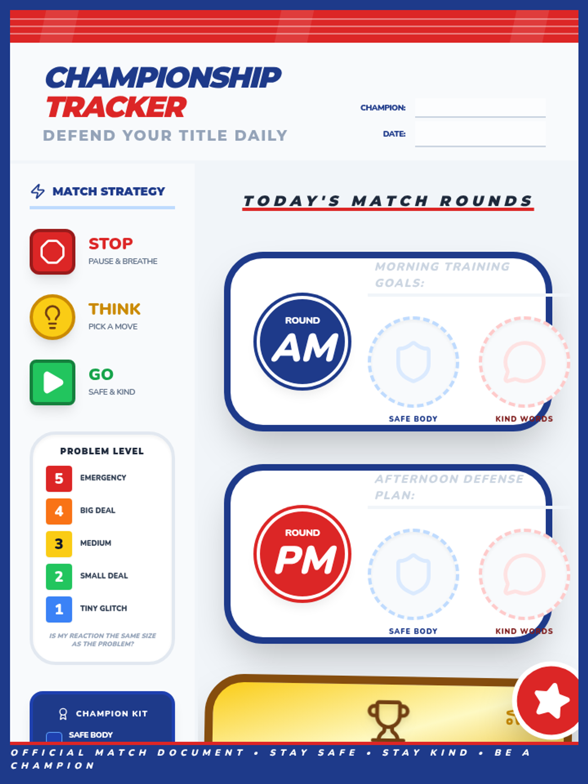 A wrestling-themed daily behavior chart specifically optimized for 8.5x11 printing. It features 7 identical match round boxes, each with icons and sticker spots for "Safe Body" and "Kind Words," plus visual strategy guides for Stop-Think-Go and Problem-Size scaling.