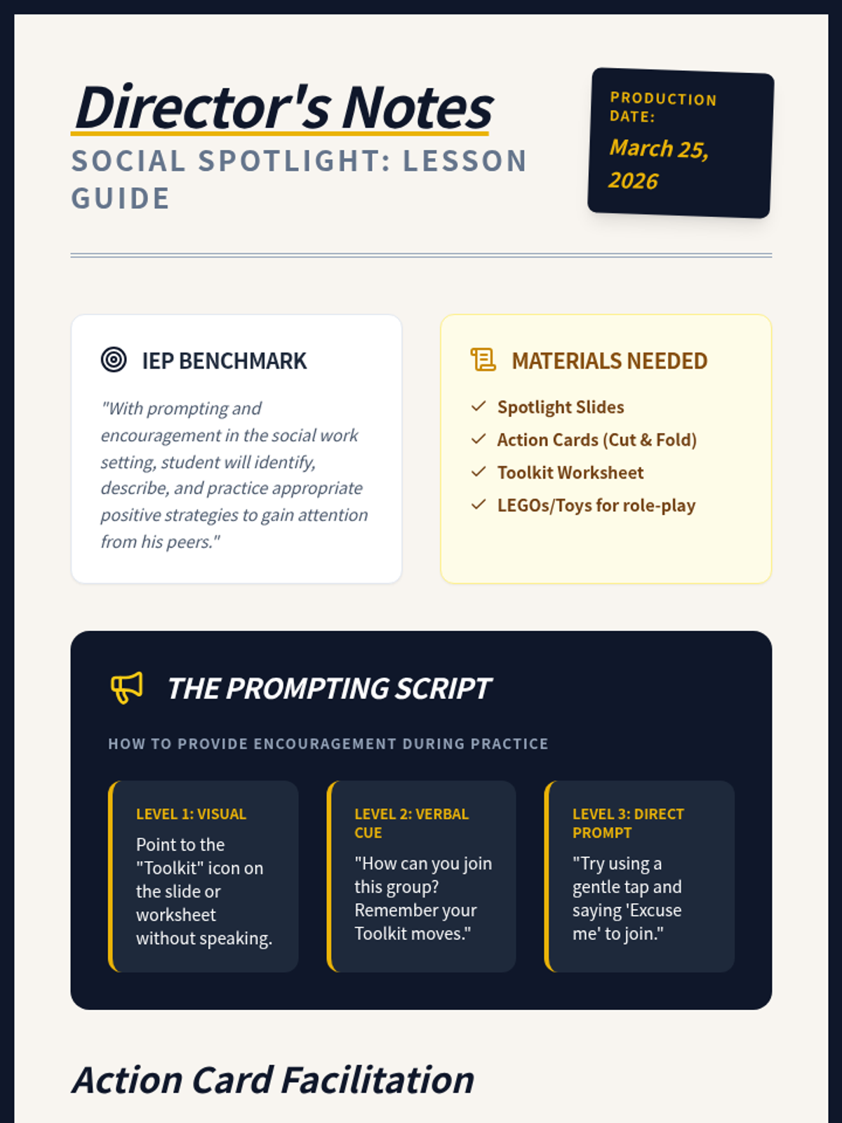 A teacher resource guide providing direct instructional points, a prompting hierarchy, and a progress tracking checklist to ensure the IEP benchmark is met effectively. Designed with a 'Director's Notebook' aesthetic.