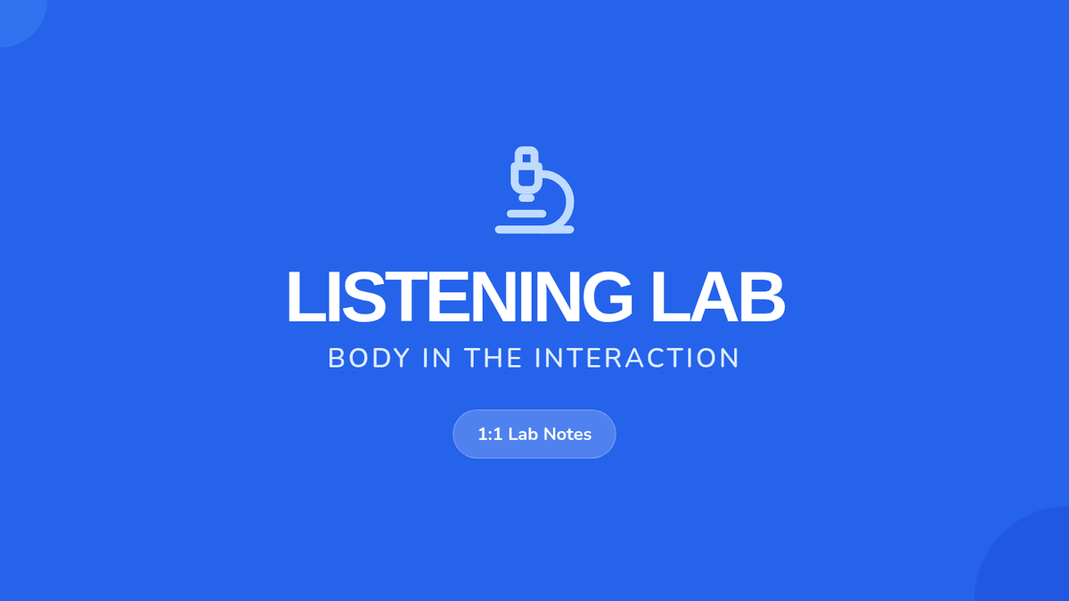 A presentation for the Listening Lab lesson, using clear visuals and bold text to teach 'Body in the Interaction' concepts in a 1:1 setting.