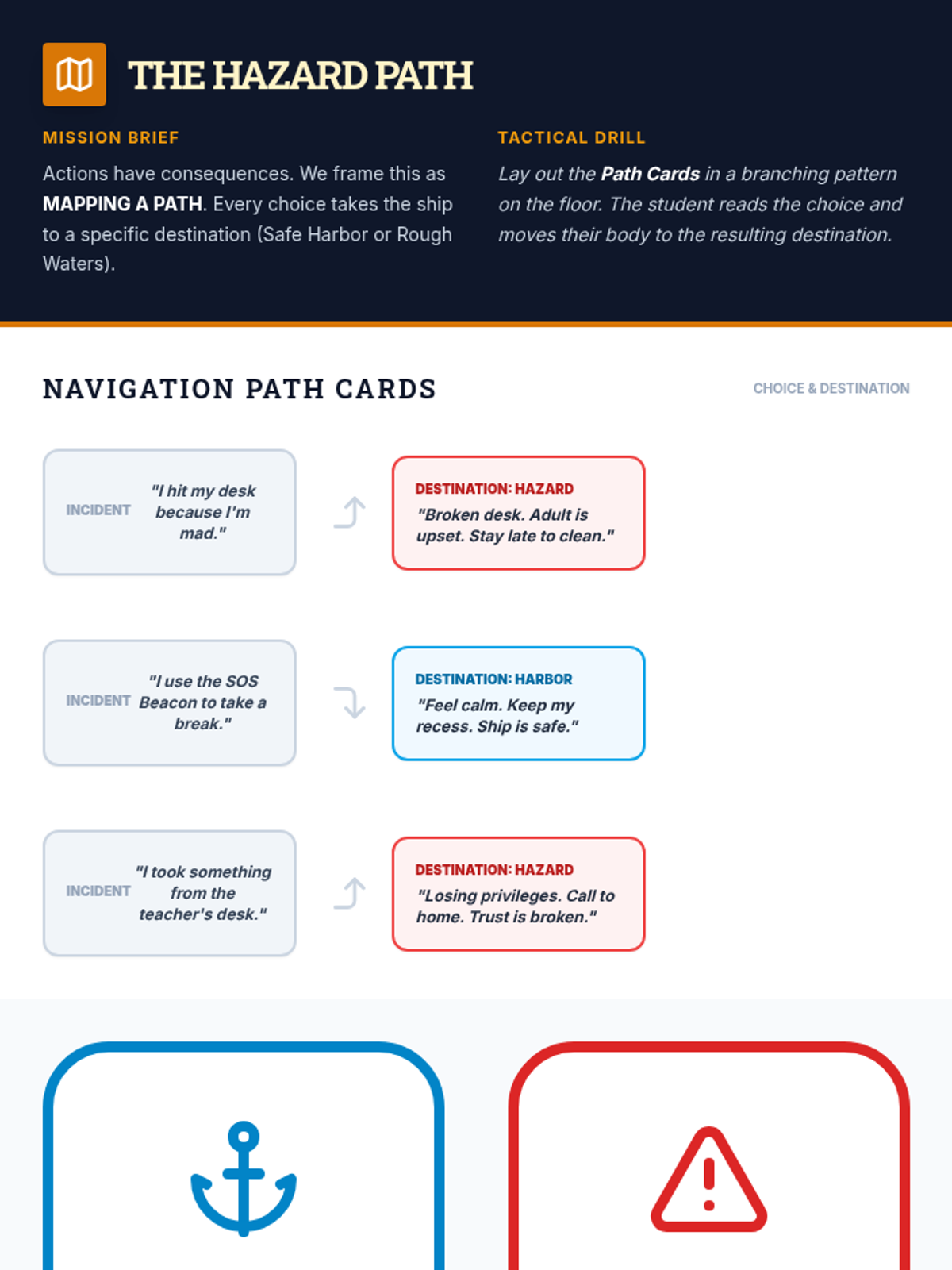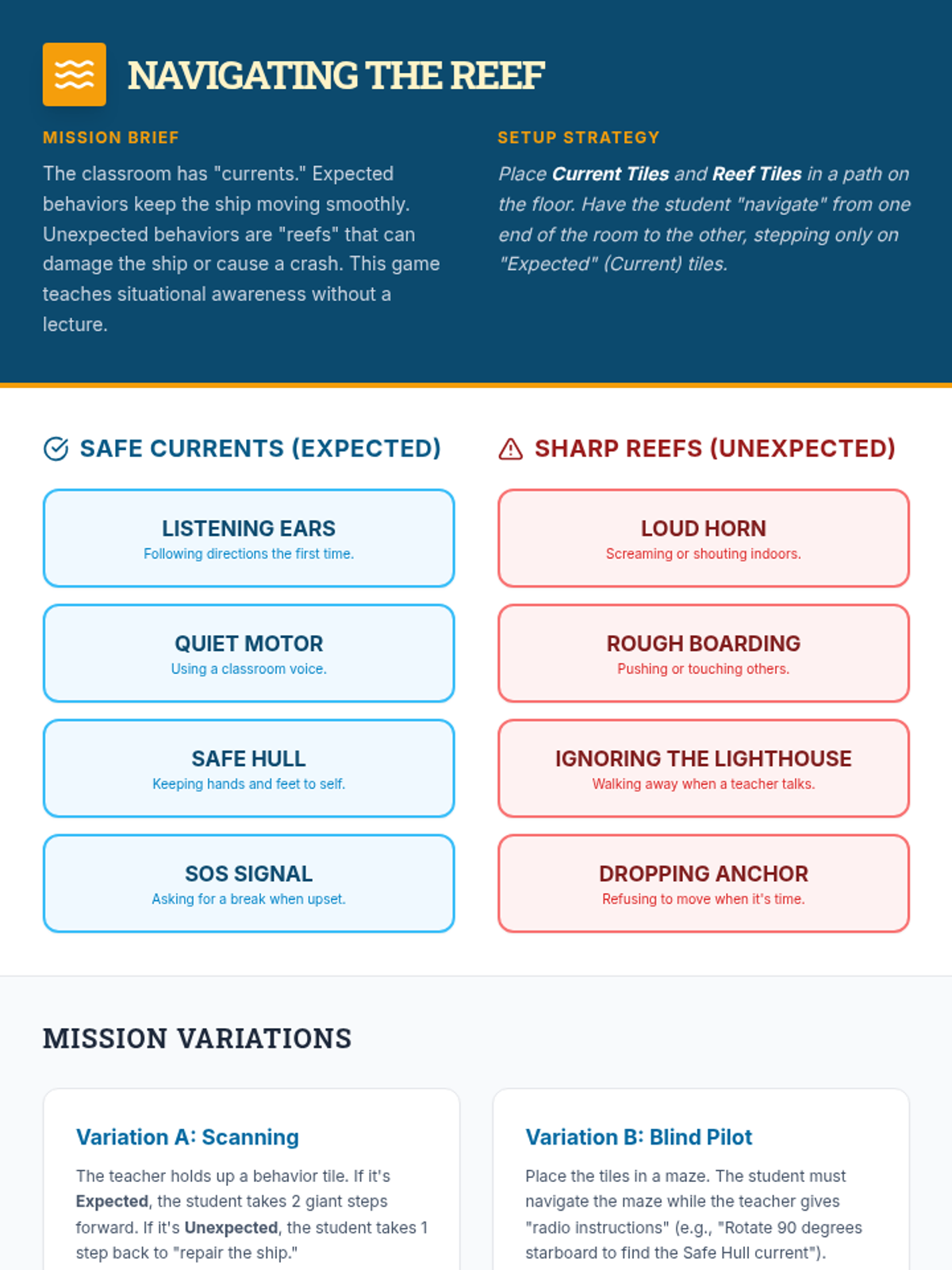 A movement-based floor game for teaching Expected vs. Unexpected behavior through a nautical theme, replacing standard worksheets with active physical navigation.